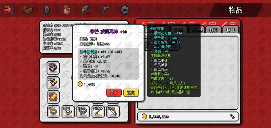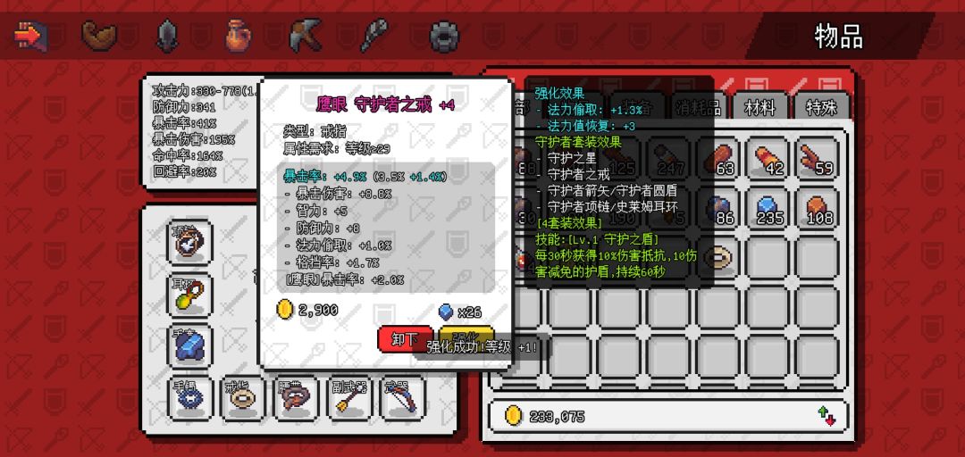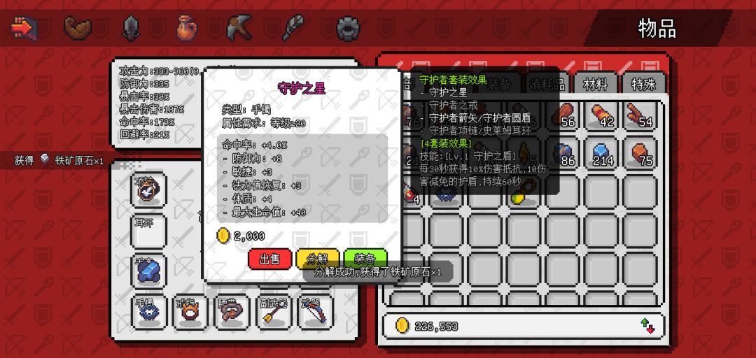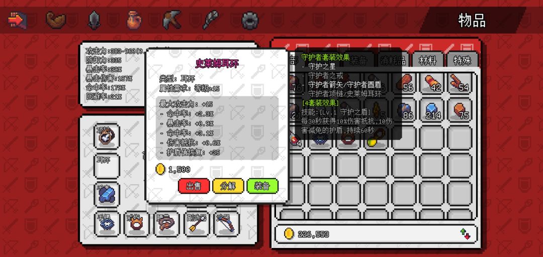 掉落三个物品,守护之星,史莱姆耳环,暴击💍(戒指过渡,其余推荐升满)