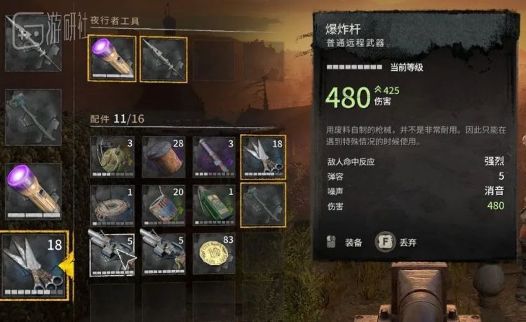 刨去那些出于致敬目的设计的彩蛋道具,在游戏的正常流程中,我只找到一把名字叫做“爆炸杆”的土制枪械,需要使用金属零件手搓出来,还需要大量的材料制造与升级,提升它的杀伤力与弹药容量,乃至实现消音的效果。