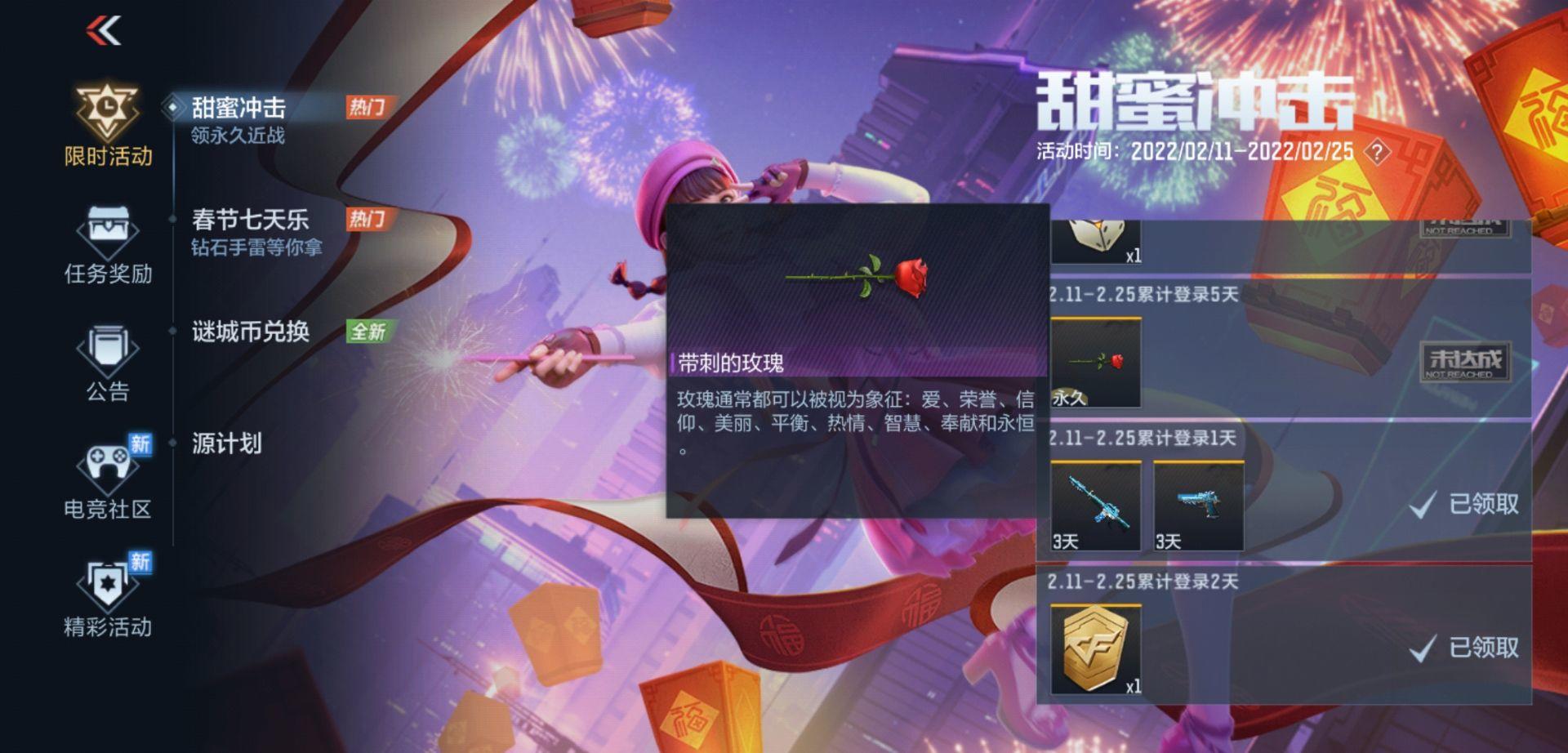 这种累登活动算是CFM中最为简单的活动之一了,这次福利不错,简单登陆即可领取永久的“带刺玫瑰”。