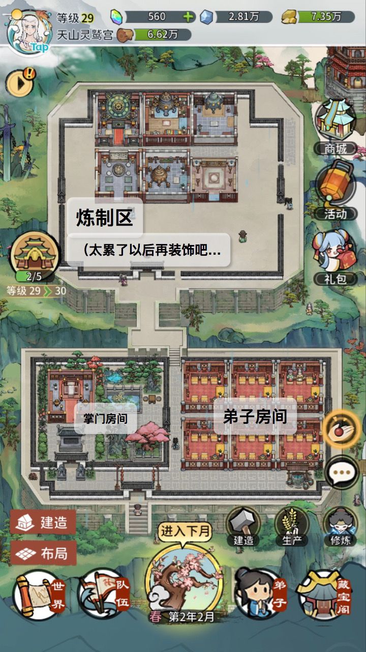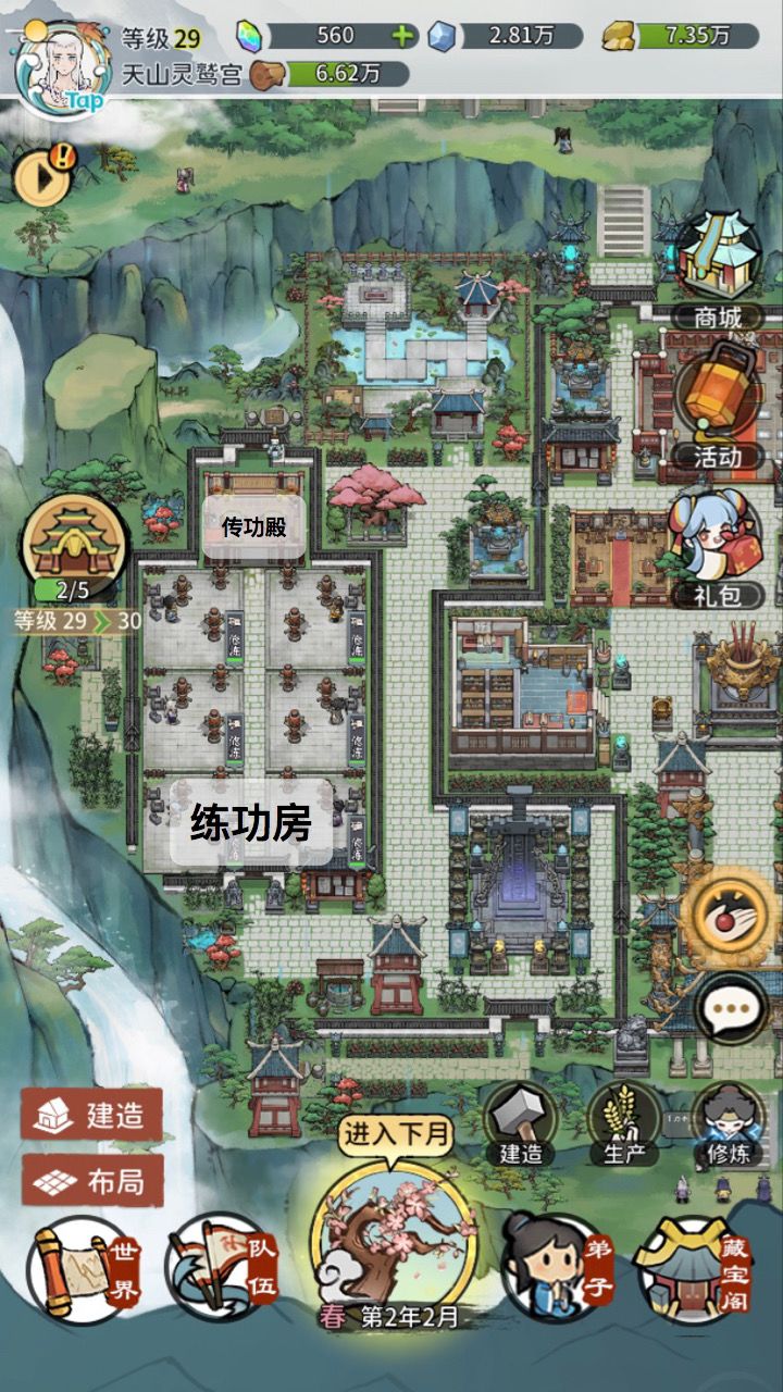 2. 左边是练功房,把练功房和传功殿放在一起,传功的时候就不用找来找去的了(我个人的游戏习惯)