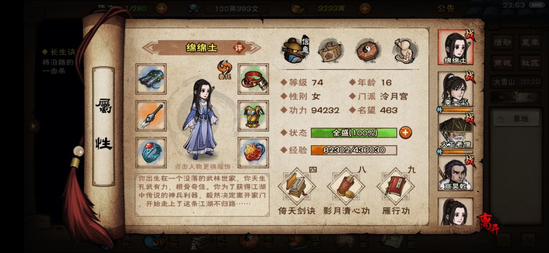 4.假设不去太乙混这半个月,那就只耗费三五天拿钢筋,合斗,活脉,没有太乙的罗浮和先天,但是冷月的上乘就快了很多,秘技和武功,买不起功德卷只能2选1了。