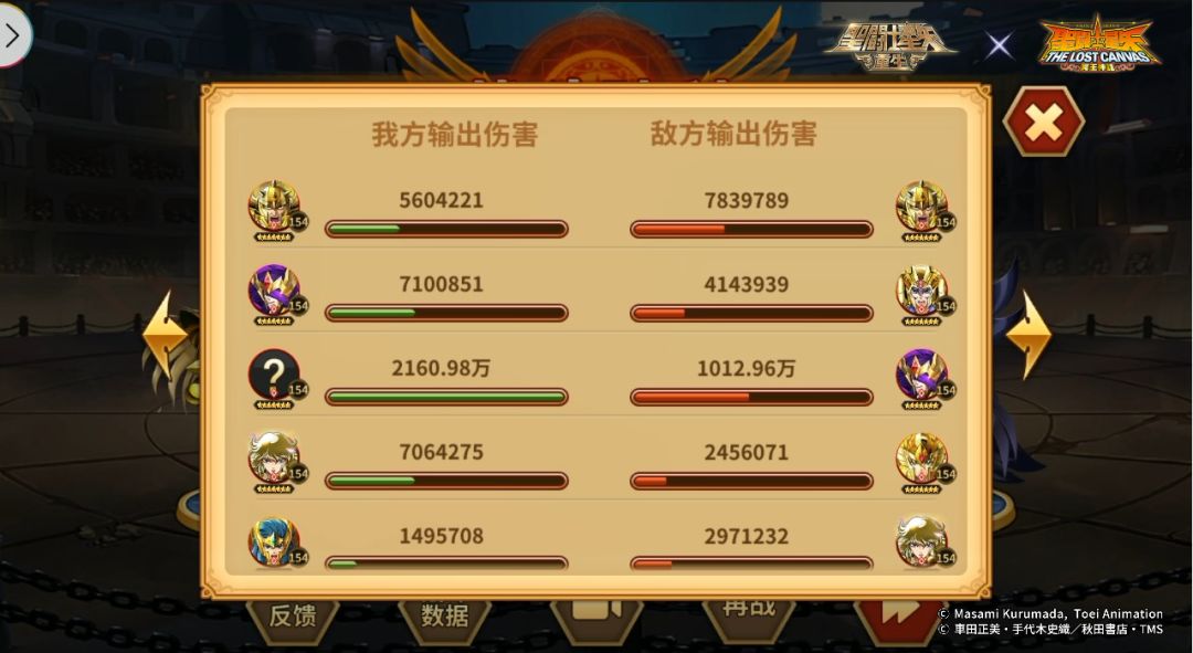 在双方的输出对比中,我方双子神·达纳托斯力压群雄,输出远超其他角色,对方唯一后排角色阿赖耶识·沙加由于被我方多次控制并未能发挥出应有的作用。