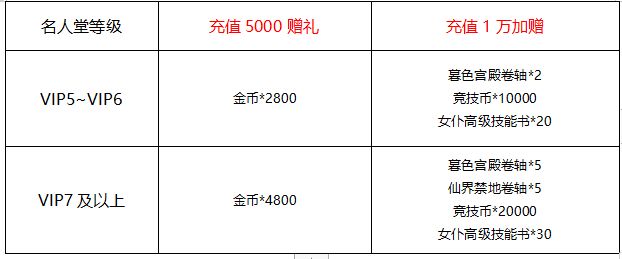 活动时间内,所有线下名人堂VIP5及以上玩家,在活动期间内的充值,达到要求后可以获得额外奖励哟!(只能领取对应VIP等级奖励)~