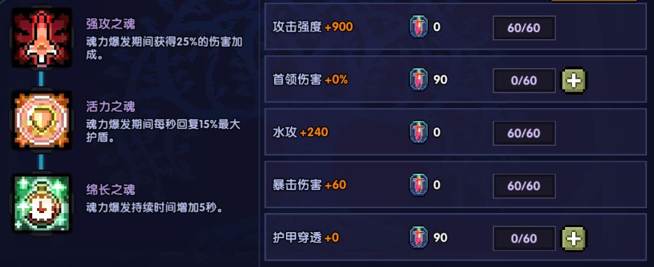 穿透点上,我由于水系只用狼刷图,所以就只有带护盾的方案魂力爆发选择强攻之魂,因为收益高一点