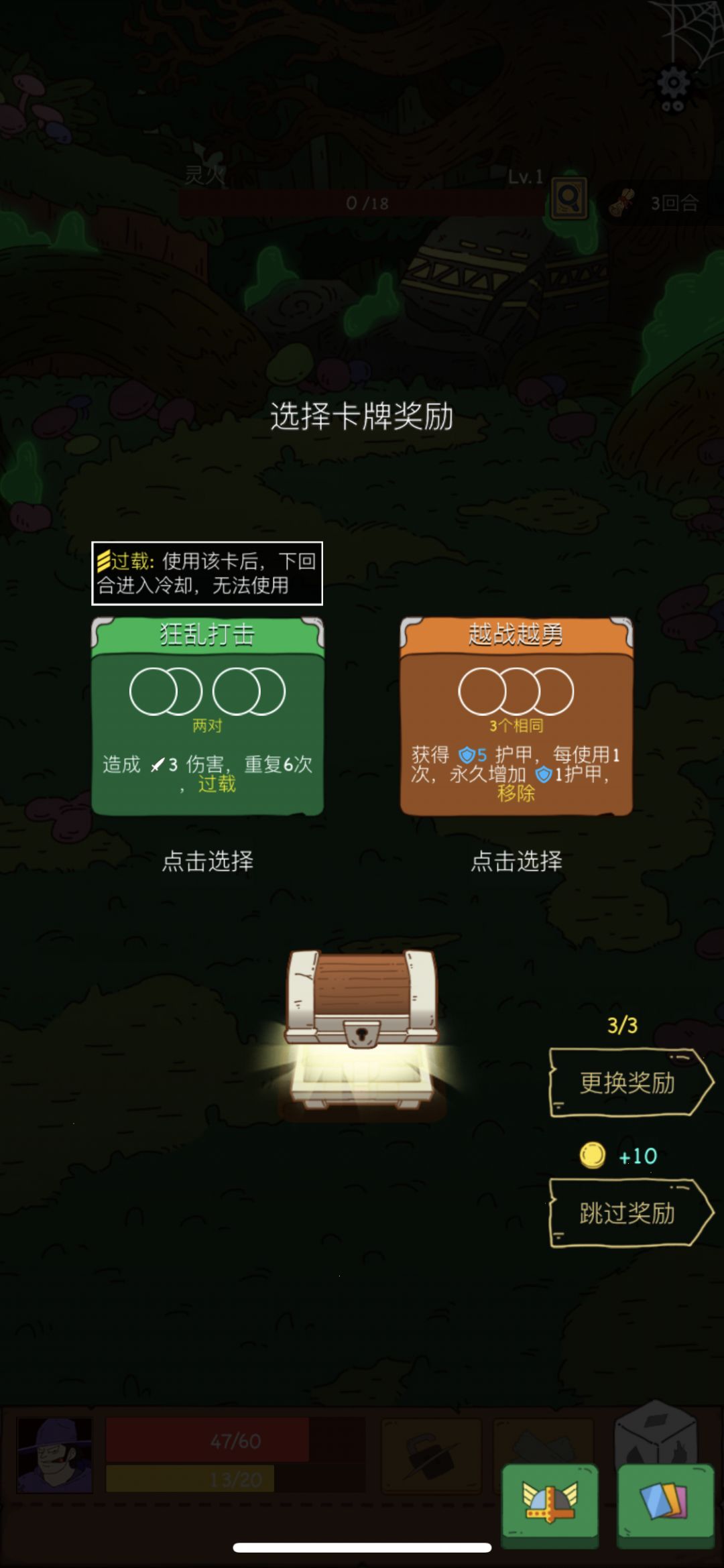 有相关升级后可以直接刷新3次,来找自已要的牌。这个时候房间是还没有结算的,在刷新三次后,如果还是没有找到要的牌,可以直接大退,然后重新打怪来刷新掉落奖励,每次可以有2*4次不同的牌,不过一般不这样打,因为挺麻烦的(如果真要打,选个好打怪刷),在追求极限时可以这样玩,比如想无尽第一层出禁令 越战 洗礼,很难的自定义之类的。怪物房间的结算节点是在你点对应的牌或者点跳过奖励后,只要你在这之前退出,都可以回到上一个房间(也可以能过这个方式来选怪,有些怪不好打,或者打一半不想打这个怪,可以直接右上角小退,这样就又会回到上一个房间)