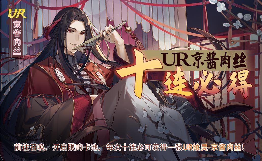 活动描述:活动期间,开启限购卡池,御侍大人可在商城界面使用幻晶石等道具兑换卡池专属道具,该卡池中UR飨灵-京酱肉丝重返缇尔菈大陆。
