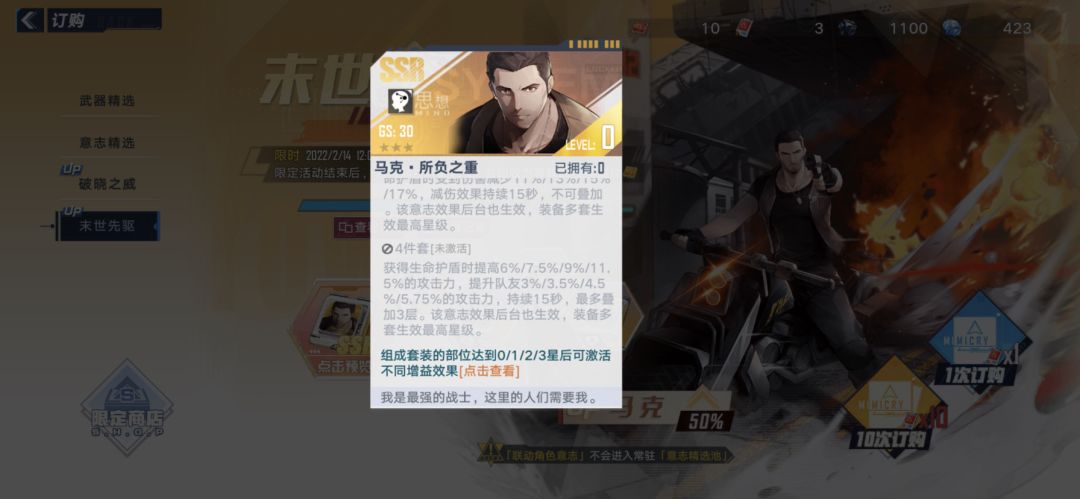 最后聊一下零的意志,因为马克是辅c,输出能力有限,两件套需要连携技触发,并且只有4秒的护盾显然是不够看的,四件套的效果很适合坦克位,输出位就不需要了,因为马克武器专属技能的限制,零意志和梅丽尔意志没法给马克提供好的流派