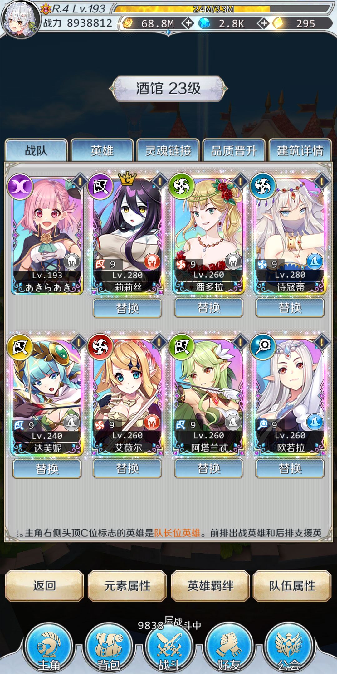 在6000层再呆上一段时间,当金装有10件左右的时候,就可以尝试6600了,6600之后可以自己做银加,在6600打造完一身的武具之后,就可以推7000了,7000是r4最重要的分割线,7000之后的羁绊,是战力系统最重要的提升方式,在7000的时候转换阵容,把除了恒晶主c不能动的,尽量转换成羁绊角色,具体羁绊可以去其他帖子看一下,我这就懒得截图啦![[嗒啦啦2_委屈]](https://img-tc.tapimg.com/market/images/dcd1df39e939537e46ee8741ed9ccf4a.png)