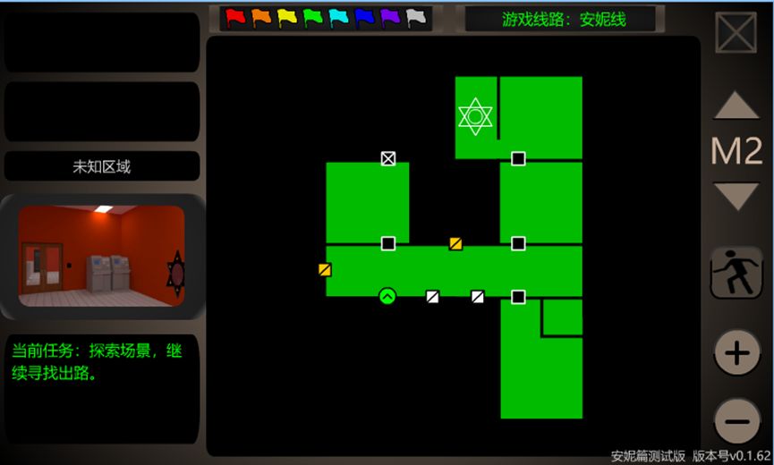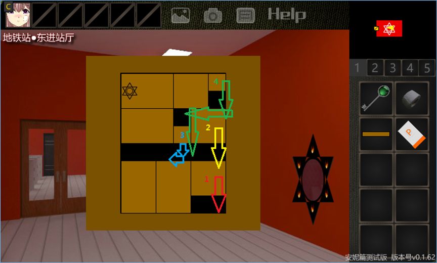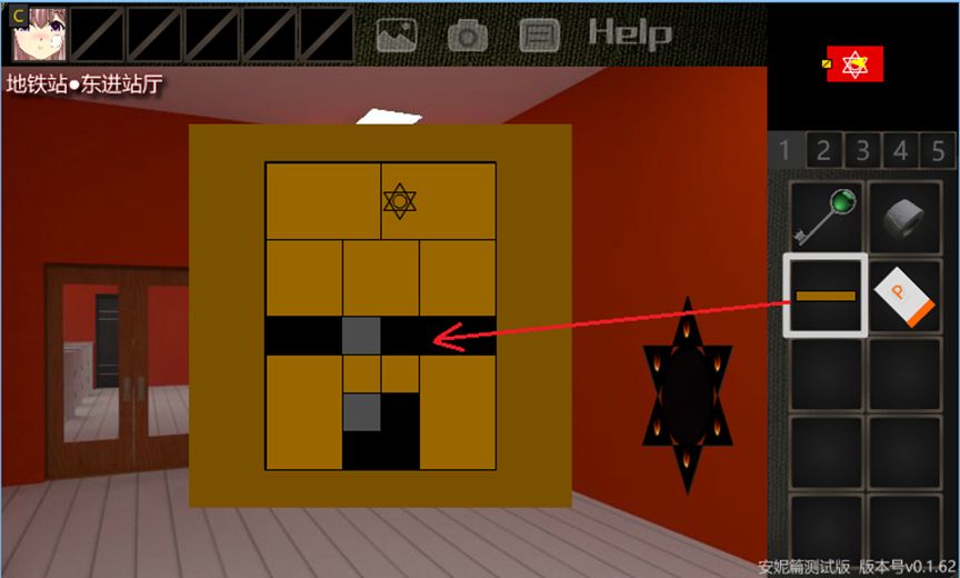 13.点击前方门旁边的密码器,发现华容道谜题。【木片】的颜色与之相同。首先注意到某个木片有六芒星图案,观察M2地图,这些木片的形状与M2地图的房间是一一对应的。则将华容道拼成A字,再插上【木片】即可完成谜题。前方门的门锁解除,进入【地铁站·西进站厅】。