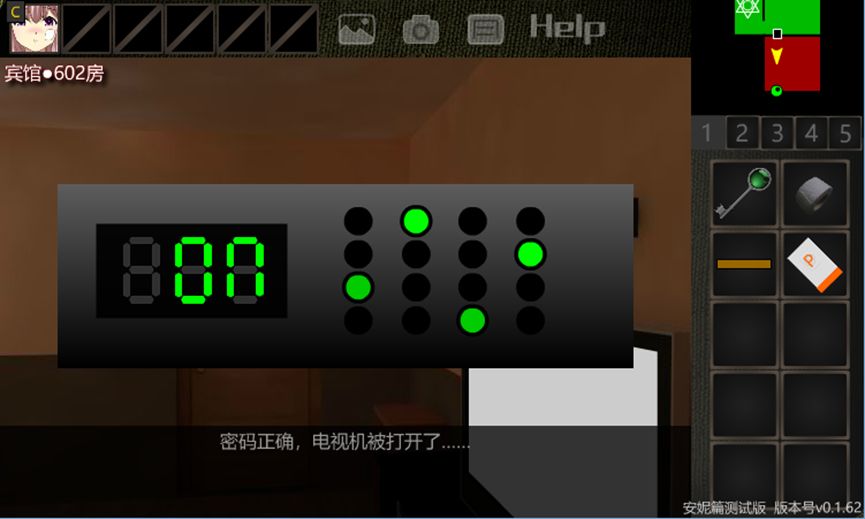 8.后退,右转,点击电视机上面的机顶盒,点击灯可以变换灯在该列的位置,经过反复尝试后发现,当横纵斜均只有一个灯时,灯就会由红变绿。所以这个谜题是“四皇后谜题”,使横纵斜的线上均只有一个灯即可完成谜题(随机!由于第一列、第二列被锁定,解法唯一),电视机打开。