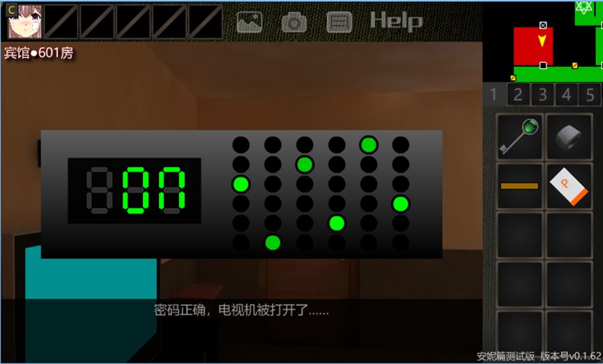 9.用【艾勒之匙】解开正前方的门,进入【宾馆·走廊】。后退,观察画,触发剧情。后退,前进2次,触发剧情。剧情结束后,点击右侧门的密码器,注意到左下角有“+”按钮,表明和线索CDEFG+AB=?有关系,再注意到木条是7位的,恰好和7个字母对应,于是木条的前5位和后2位相加就是密码(不考虑最高位的0)。进入【宾馆·601房】。
