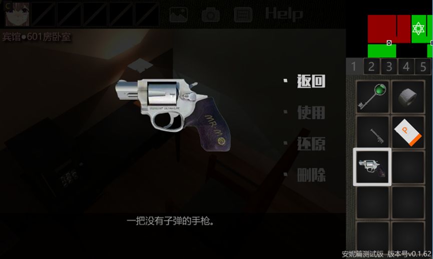 16.回到【宾馆·602房卧室】,取走洗手池上的【2号钥匙齿】,翻窗户,进入【宾馆·601房卧室】。后退2次,靠近保险箱,取走【手枪】。观察【手枪】,注意到写着MR.M。