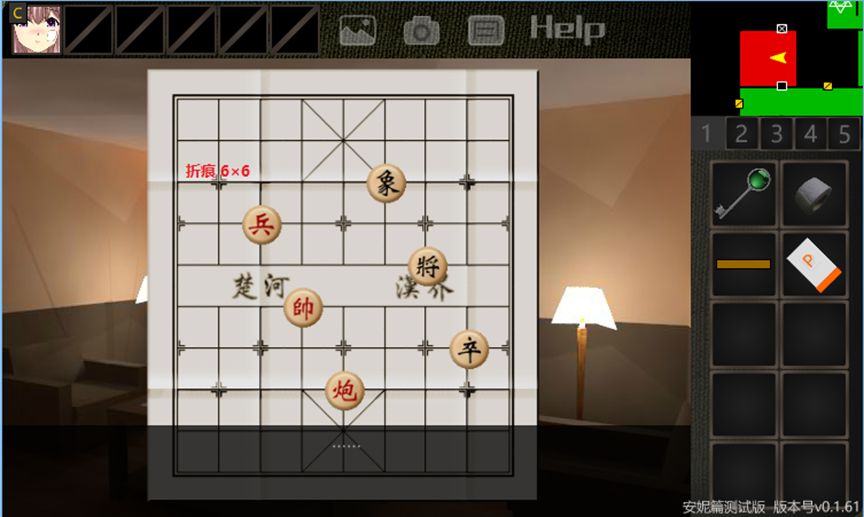 11.右转,桌子上有乱走象棋谜题。注意到棋子有6个,并且有四道折痕,围成了6×6的形状。由于棋子为6个,使我们联想到了刚刚解开的“六皇后谜题”,将它们围成六皇后即可(解法有4种)。柜门解锁。点击右侧柜门,获得【人偶的左臂】。