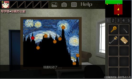 14.剧情结束后,后退,点击前方“星夜图”挂面,发现黑色的轮廓与股票走势图一样。再注意到红图钉恰好钉在了一个停止点。根据提示,把所有图钉钉在其他停止点上,再点击挂面,暗格打开,得到【“天枢”之象征】(橙色徽章)。组合手中的【“天枢”之象征】和【5号钥匙齿】,获得【天枢之钥-5】。