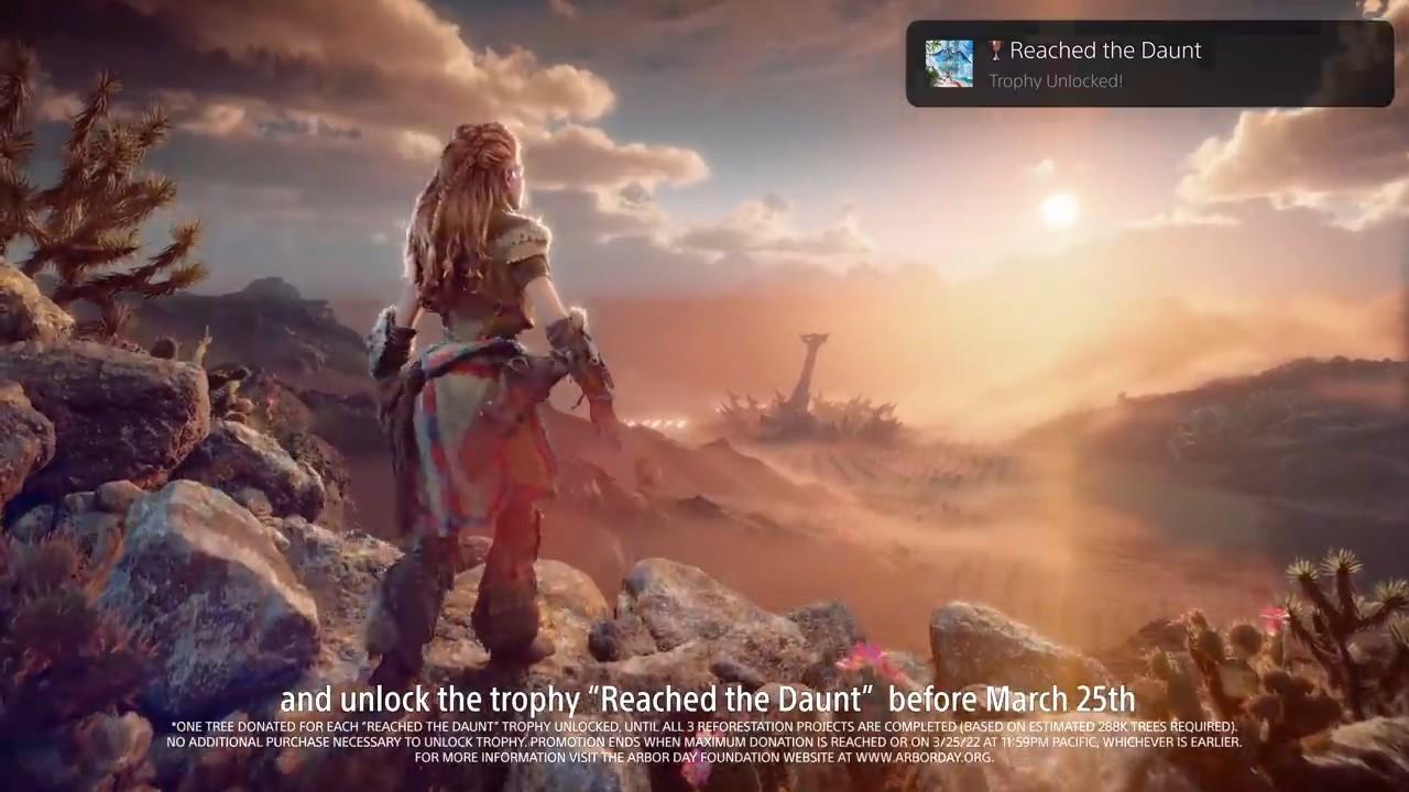 具体来说,只要玩家在3月25日之前游玩《地平线:西之绝境》,并且解锁游戏中一个名为“Reached the Daunt”的奖杯项目,那么就可以在索尼及Arbor Day Foundation(美国植树节基金会)的帮助下种下一棵树。