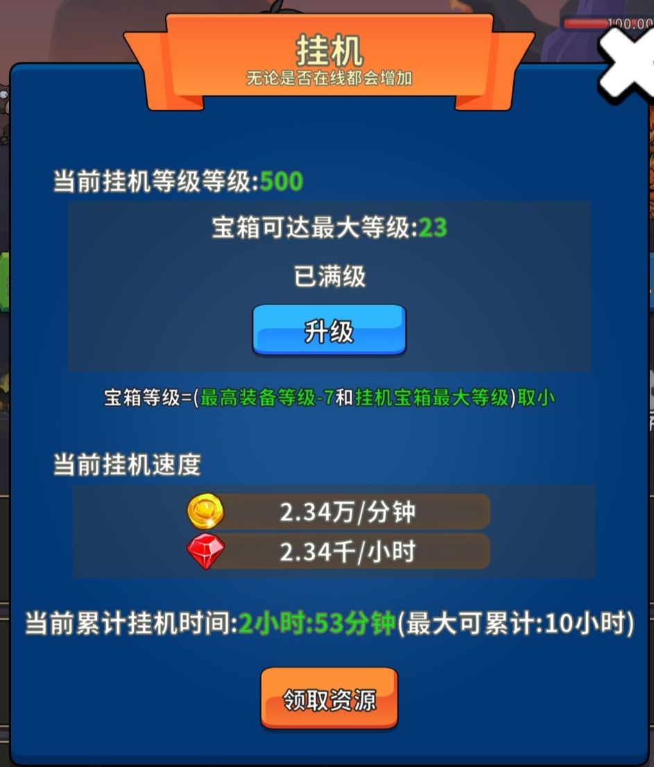 当挂机等级升级冷却低于1小时的时候可以看广告加速冷却,前期提升挂机等级可以加宝箱等级(最高23级)可以让你更快制造30级宝物。