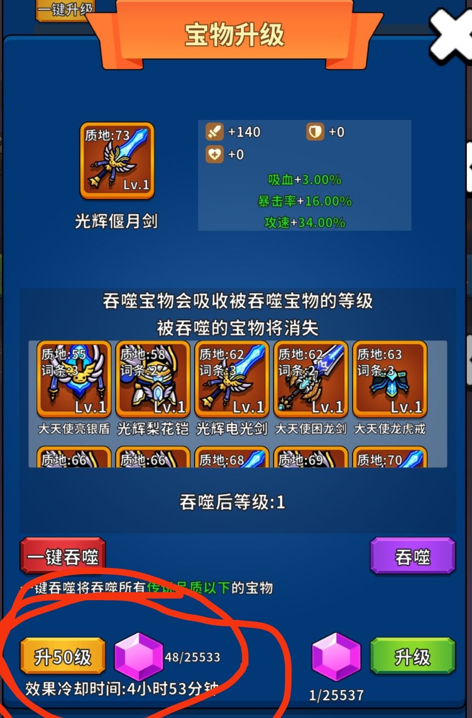 点击宝物升级,有升50级按钮,概率触发装备直升英雄等级,冷却时长8小时。