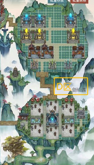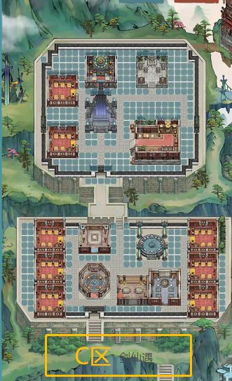 3,背后逻辑:分区时考虑到了不同建筑物的使用频次和相关度。比如药园和炼丹区,当我们需要炼制某种丹药时,根据需要的材料可直接在旁边调整弟子种植,而不用拔来拔去。又或者将高频点击建筑放在一起。低频点击建筑放在一起