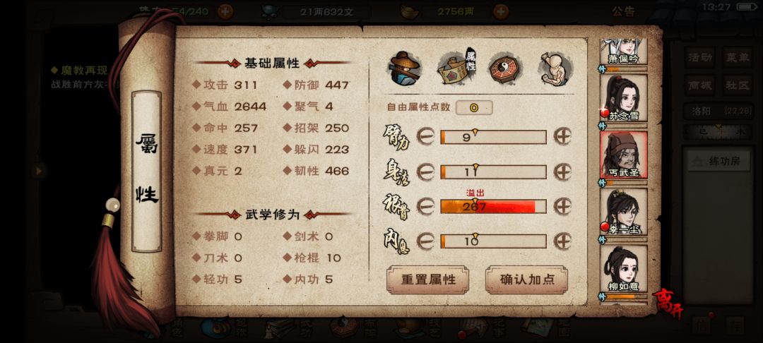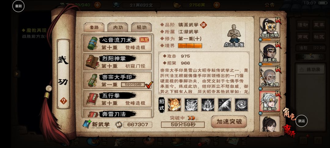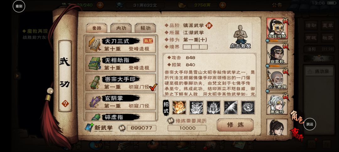 我队里每个随从都在突破武学,其中主角是天刀镇派轻功7升8,商是玄冥经8升9,老僧是九转,萧是大手印。下面还有乞丐在凑修为等等等。。。