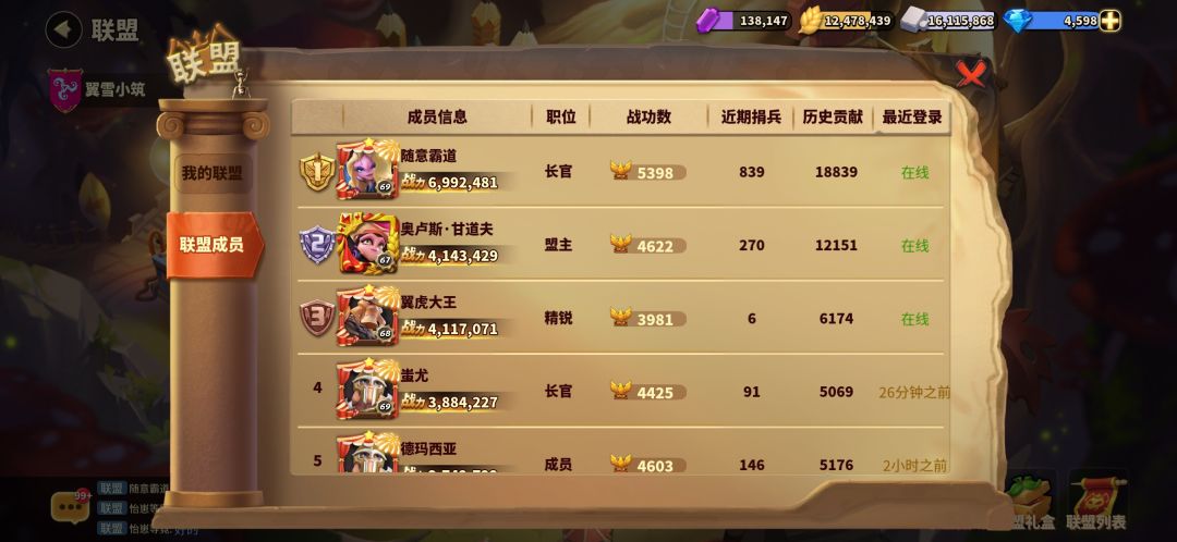 联盟介绍:本联盟创立于2022年1月19号,从创立之初就吸引了大多数玩家的加入,随着联盟发展,进进出出不少人,但是确有这那么些人一直在坚持着,发展到今天,联盟微信活跃人数达到21人,游戏活跃人数达到40加,基本上联盟内的人都保持每天在线。我们联盟人均战力可能不太高,但是我们联盟战目前为止只有一败,基本全胜,每次联盟战,群内都积极参加交流,哪怕没时间打都会把号叫给盟友去打,蚁王之战目前两次,一次第一,一次第二。我们不在乎结果,只在乎过程,只要我们努力了,只要我们尽力了,我们就问心无愧,路遇强敌必亮剑。欢迎新老玩家的加入和转区加入。群内很多老玩家都可以为你解答游戏内的一切疑难问题,可先通过我的微信13852751714加入我们的微信群,感受一下我们联盟和谐友爱的氛围。