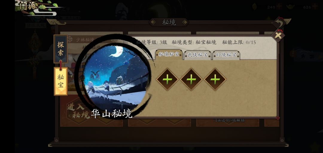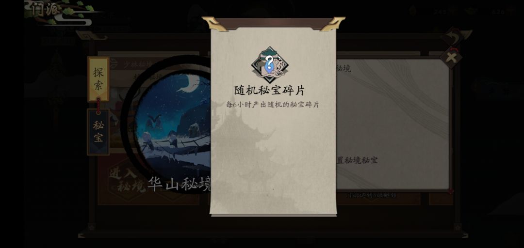 在门派达到三级后,解锁华山秘境(秘宝秘境,已经标明了类别)