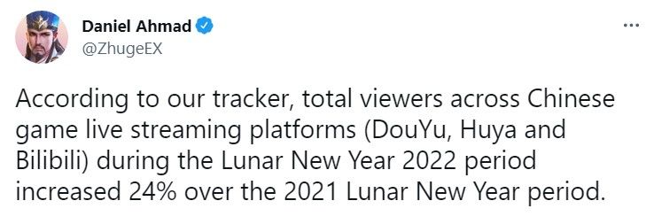 NPD著名分析师Daniel Ahmad在推特中写道:根据我们的追踪数据,2022年农历新年期间中国游戏直播平台(斗鱼、虎牙和哔哩哔哩)的总观众人数比2021年农历新年期间增长了24%。
