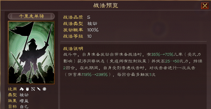 辅助型的被动战法,战法分两种预备效果:1、获得2回合洞察(千里单骑[预备])并提高50武力;2、反击一次238%的兵刃伤害(单骑神勇[预备])