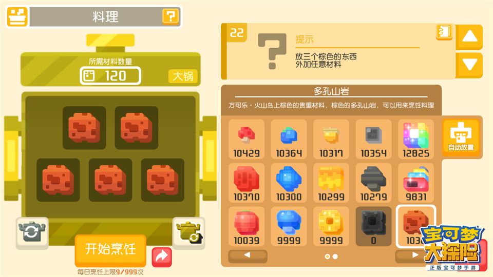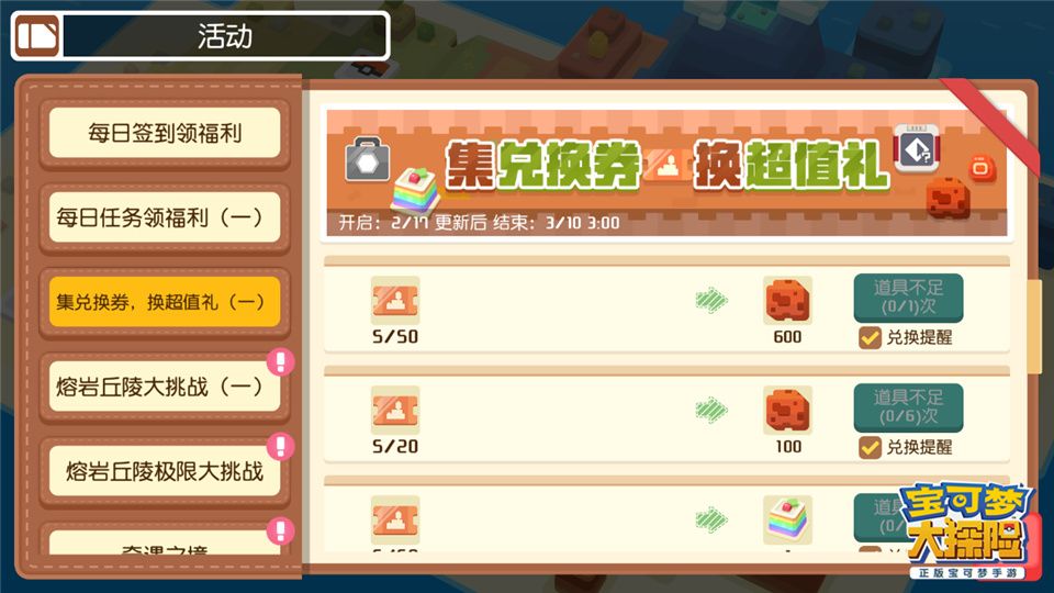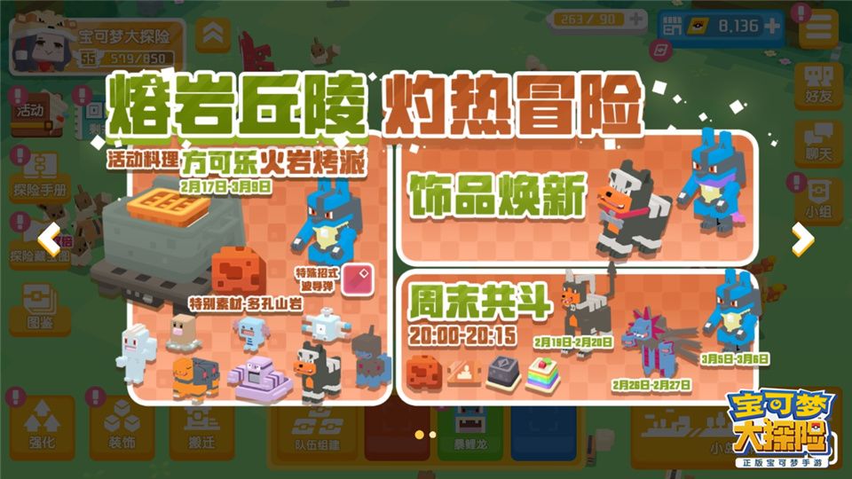 冒险开启熔岩丘陵盛产“多孔山岩”和“火玛瑙”,使用“多孔山岩”和“火玛瑙”进行烹饪,做出活动料理“方可乐火岩烤派”,探险家们就有机会和新世代宝可梦单首龙、戴鲁比、煤炭龟和路卡利欧(有机会携带新招式“波导弹”)成为伙伴!