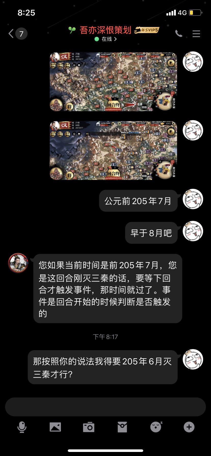 平民只能养一队,极限时间公元前205年7月灭三秦,结果没有触发事件,客服反馈如上图。