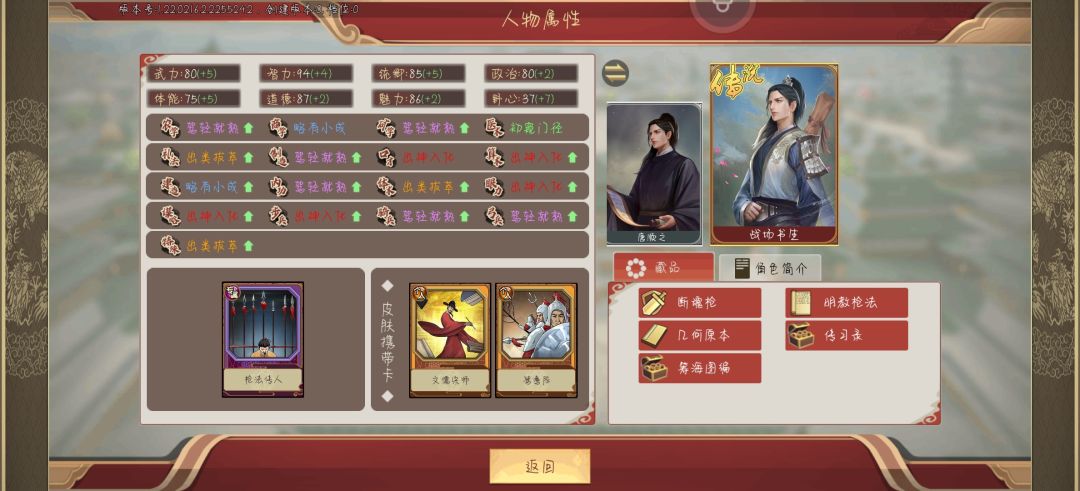 开局我选择了书宗画圣(金钱来源)、天生神将(打架用的)、勇闯少林(提前拿洗髓经和经脉书)我选择京师开局。毕竟京师比较繁华,而且各种资源都挺多。进游戏先把传习录和筹海图编用了,再把断魂枪装备上,那么属性就是这样的。