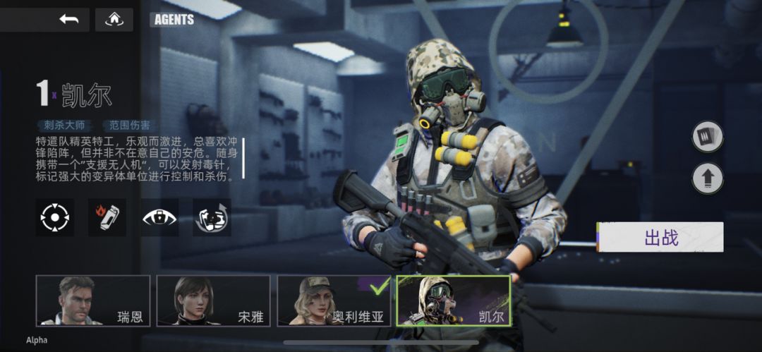 特遣队精英特工,乐观而激进,总喜欢冲锋陷阵,但并非不在意自己的安危。随身携带一个”支援无人机“,可以发射毒针,标记强大的变异体单位进行控制和杀伤。