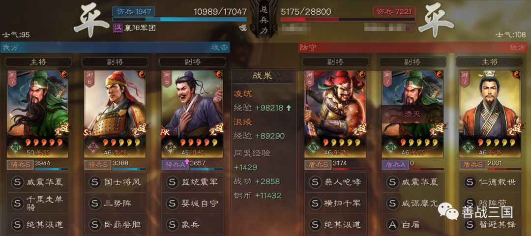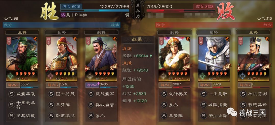 特别是在进攻远征时(格子多),士气不足伤害不够总会打平,这时候千里关羽压前开路,吴骑可以算着时间跟在后边补刀收割。这里千里三势关羽拖平三队,后面的虎豹吴骑补刀轻松收割。