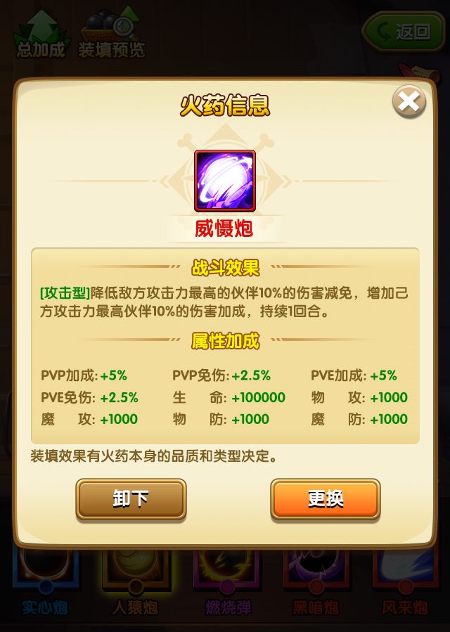 火药装填后,全体上阵伙伴属性会进行加成,装填的火药品质越高、主炮位等级越高,带来的属性提升就越高。