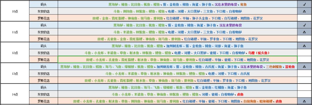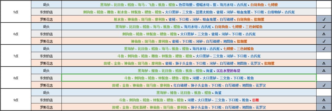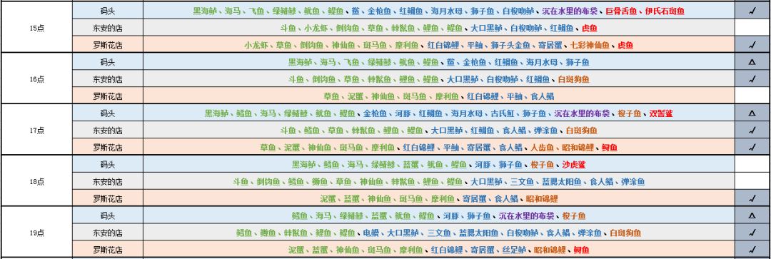 表格后面的推荐只是我个人建议,仅供参考。✓的意思代表“是当前时间段三个钓鱼点中适合钓鱼的地点”,△代表“可以选择”的意思,空白则是“不建议”的意思。我评价的标准是:该地点在当前时间段,稀有度低的鱼少,稀有度高的鱼多,整体鱼的品种少,那就是适合的。如果该时间段三个钓鱼点出现的鱼种类和低稀有度鱼均较多,那么就选择去出现更多高稀有度鱼的钓鱼点,毕竟相同条件下稀有鱼多点还是更好,万一钓到呢。→_→