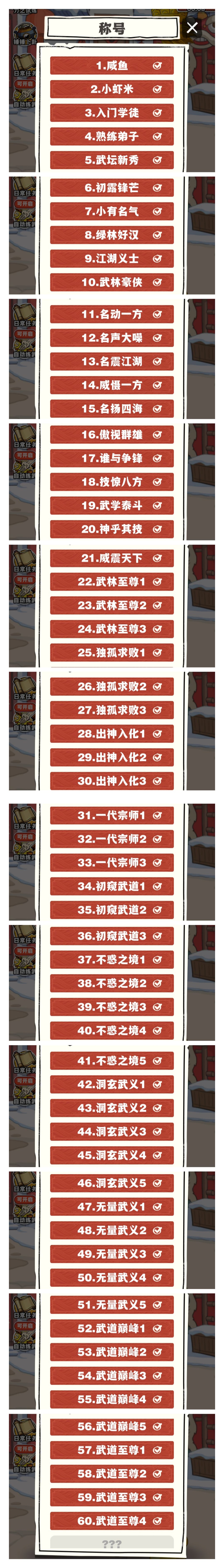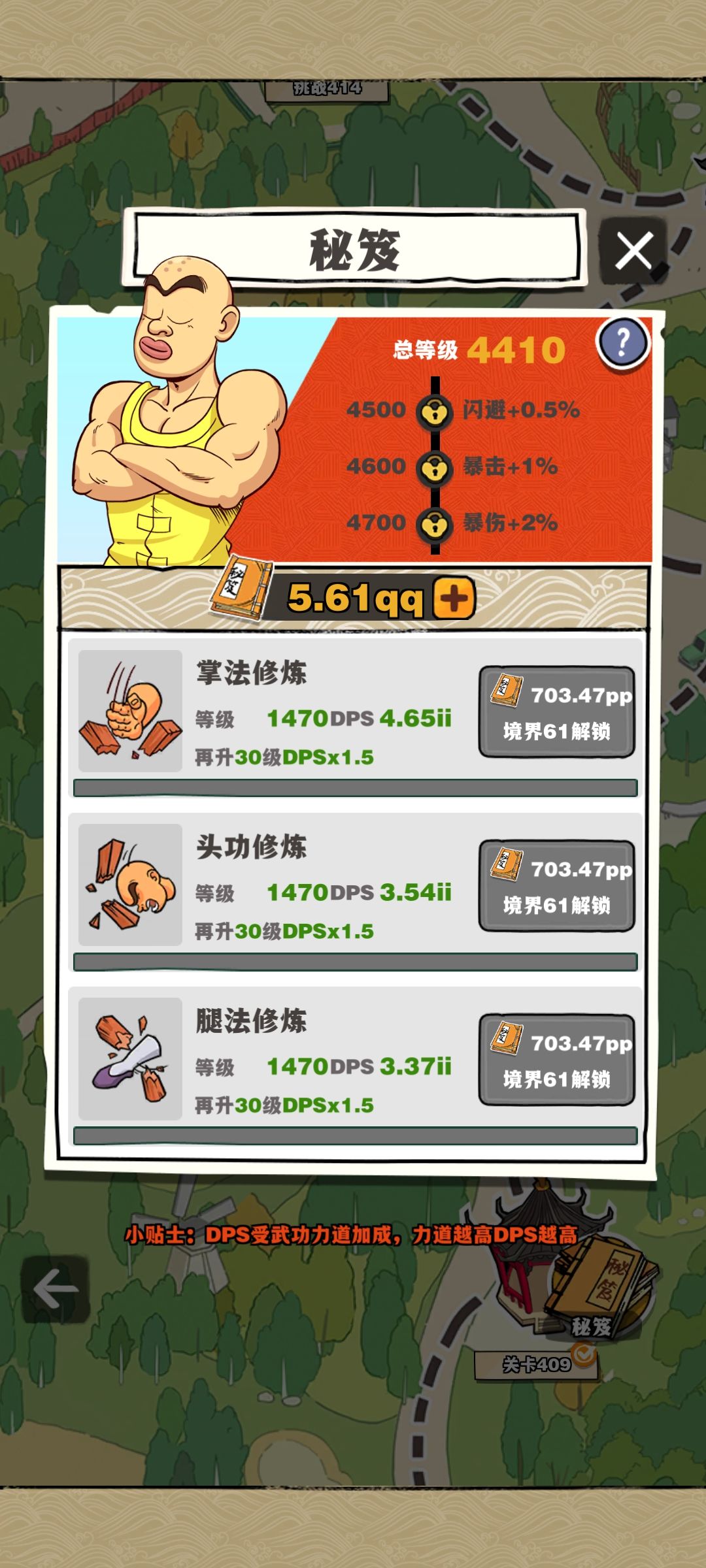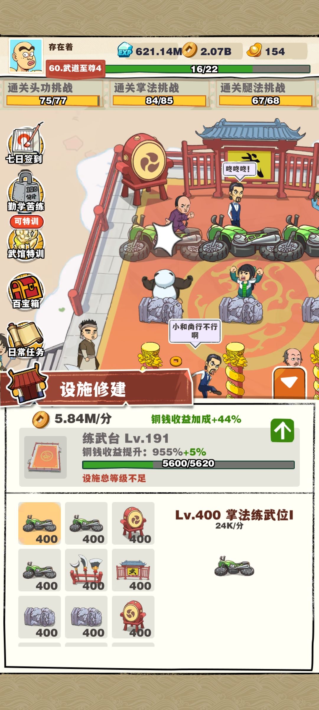 武馆设施最高400级,总等级191级,伙伴等级最高27,角色等级60武道至尊4,道馆挑战修炼等级1470,可以打到关卡410。