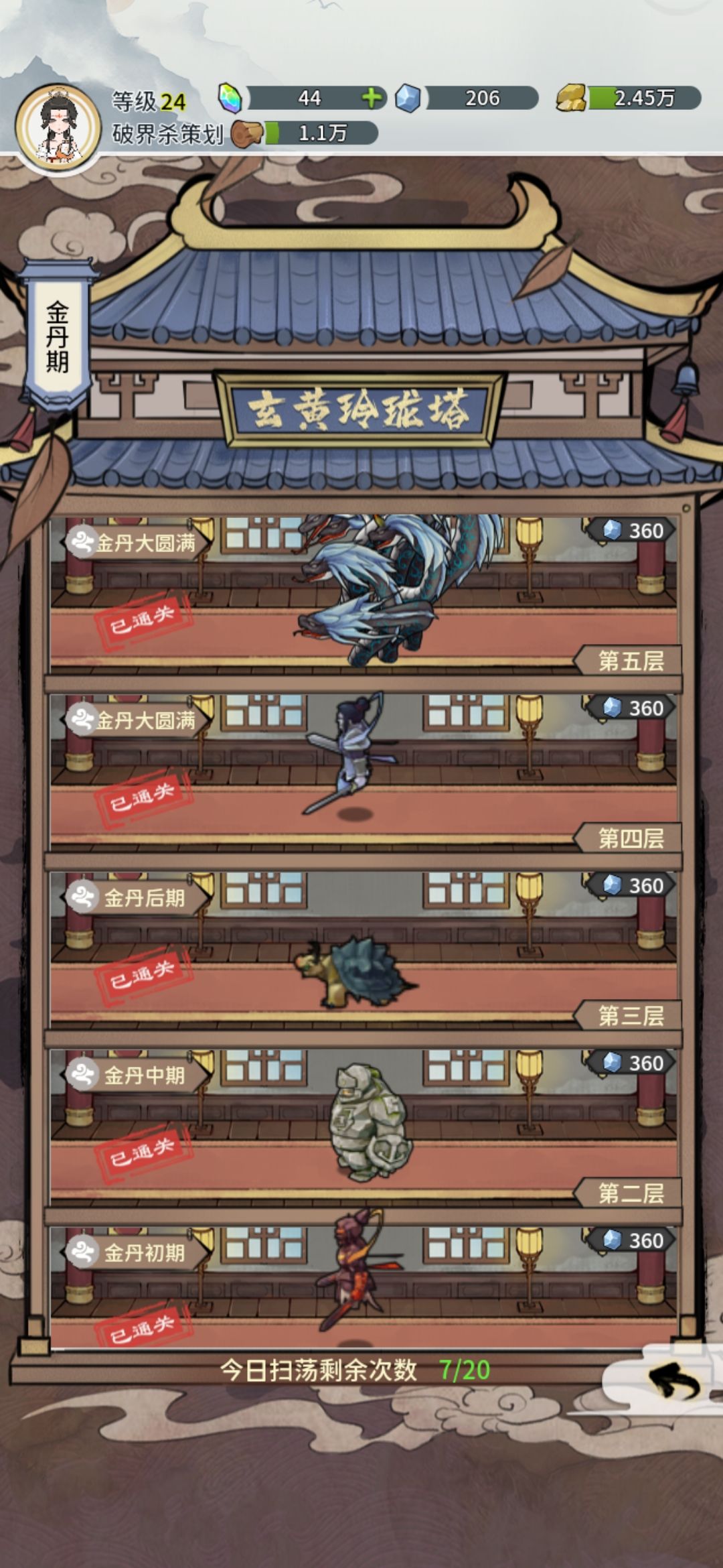 金丹之前不用炼器种药什么的,就是见怪就打,打不过就打别的,把能去的地图怪都刷了,遇到npc如果有金丹武器,金丹武器胚,增加属性的丹药就讨要,能要到最好,要不到也没事。 金丹期就要练法宝了,法宝搭配很重要,不要一键炼制,弄那些带额外属性的法宝,比如锤的控制,减防,印的控制,刀的吸血,主角和小师妹当c位 最好全员都是金丹期法宝,方便过去古国那个守门蝎子,材料不够的也可以扫荡下副本,我开局的200仙晶兑换了个灵石以及铁矿。用铁矿把所有金丹武器都强化到了10(其实到10也消耗不了多少资源,但10以后就没必要强化了)