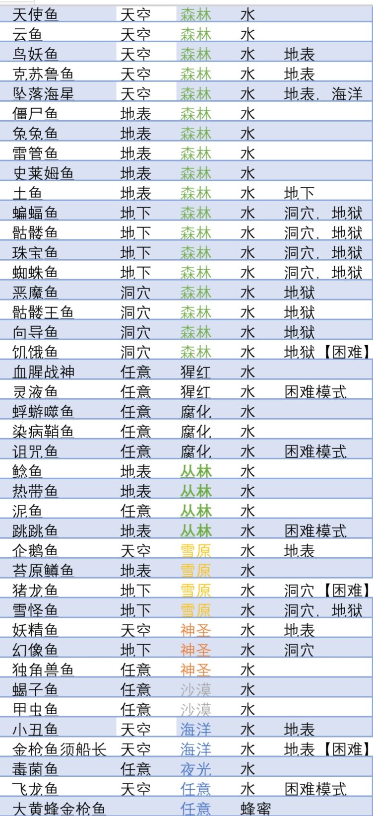 这是任务鱼的图,可见天空,地表,地下,洞穴这四个环境就够用了,普通渔获也多在地表,地下位置。一般钓鱼池也要建设多个,可与刷怪场部分重合