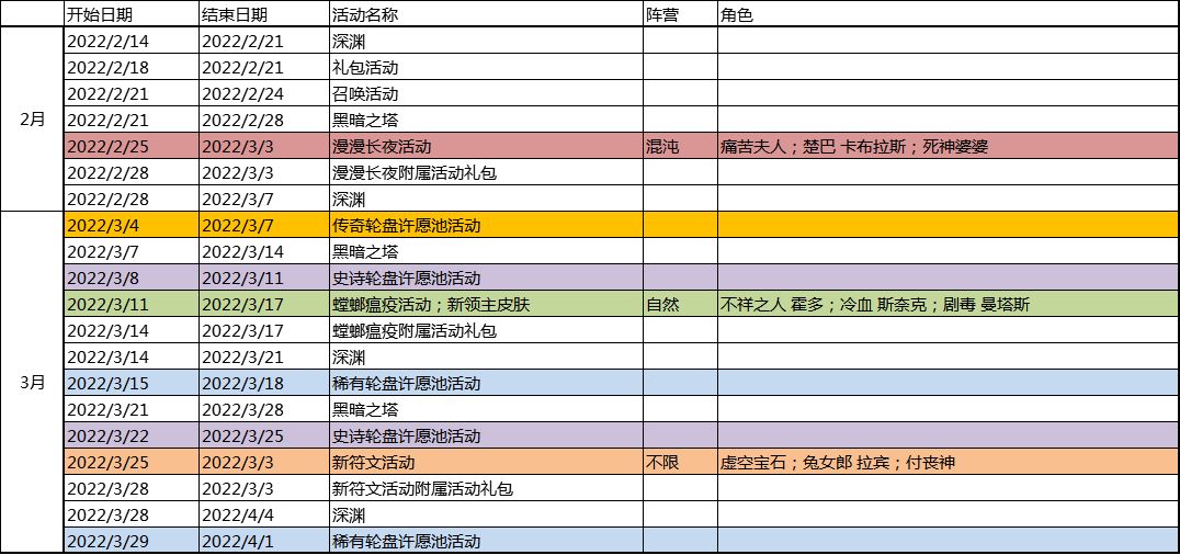 原本2月只有一次符文活动,但为了保障活动轮次足够且大家能够适应每个月两次符文活动的节奏,经过和研发方的讨论,我们决定为大家在2月25日开启第二次符文活动“漫漫长夜”,以帮助大家获取更多的卡牌等资源,培养更多变的阵容。原定于2月25日的传奇轮盘许愿池活动顺延至3月4日开启。