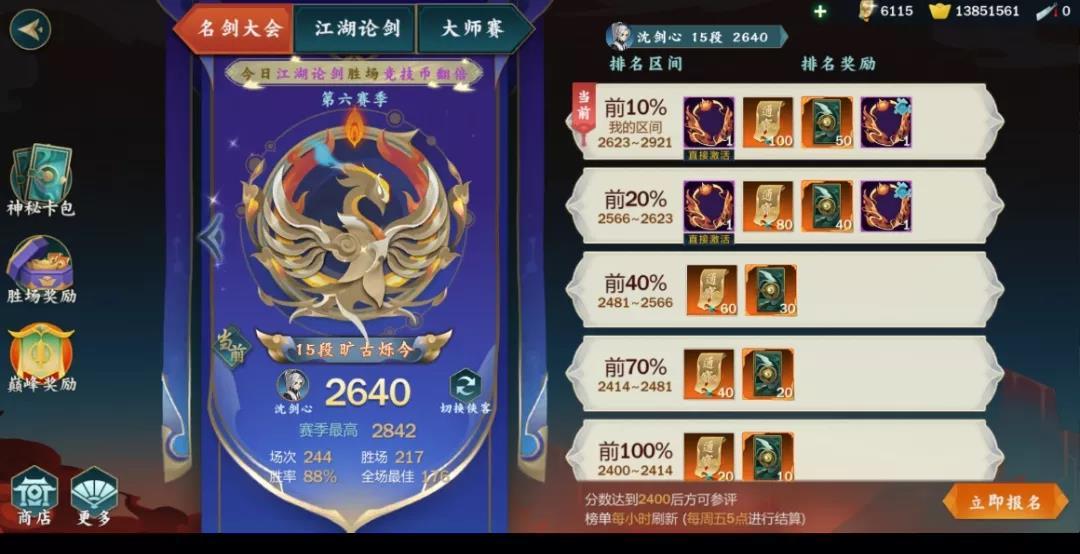总体来看,本赛季剑心PVP能力有了很大改观,给他排个序的话应该在t1.5的位置,和排在前列的角色比起来,属于刷不过伤害,打不了击杀,但是控场能力足够强,能够和队友形成很好配合。