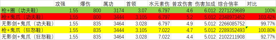 武器的比较我选择了3中比较常见的搭配,1.枪+圈,2.枪+鬼爪, 3.无影剑+鬼爪(不想做枪的小伙伴😡)和分别用狂怒鞋和功夫鞋的提升