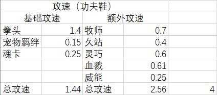 那么知道了功夫鞋的机制后,我们就可以来计算攻速了,这里我列了一张表格,基础攻速这的总和会被*0.8,而额外攻速则不会被影响,那么我们得到了卡4.0攻速的搭配则为久站+威能+魂卡0.25攻速