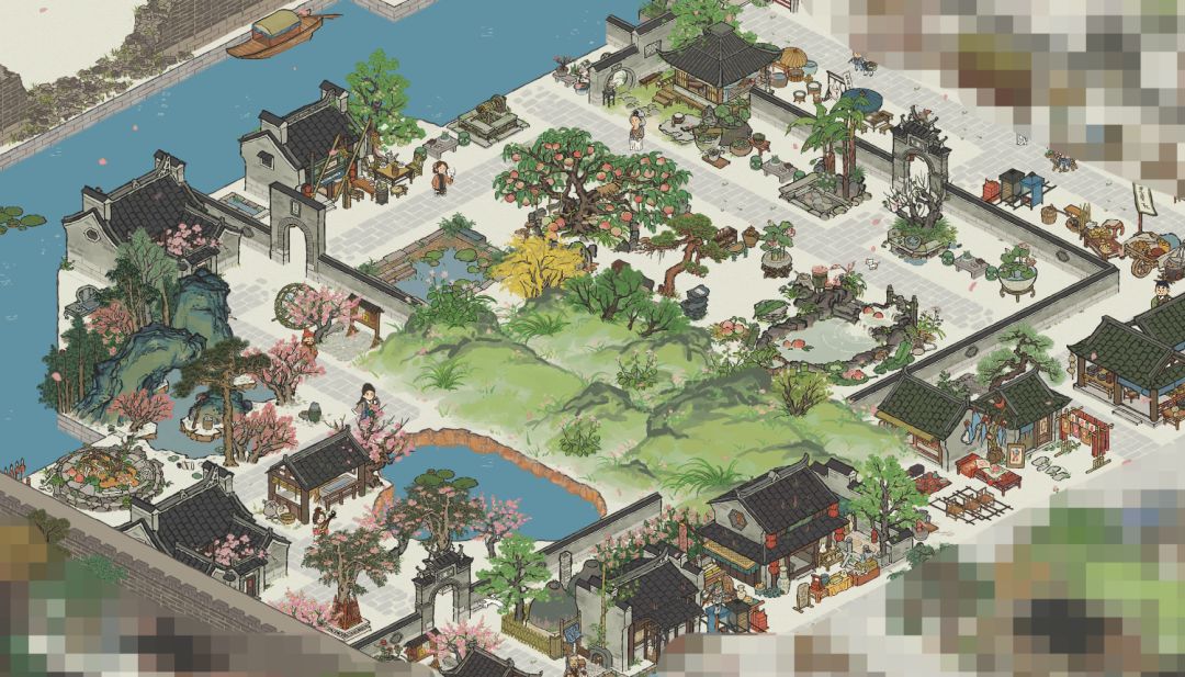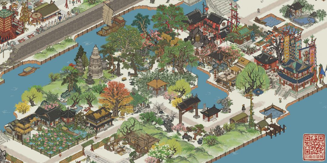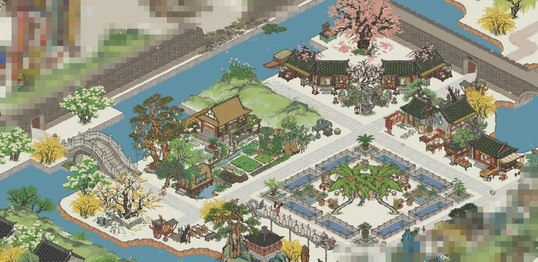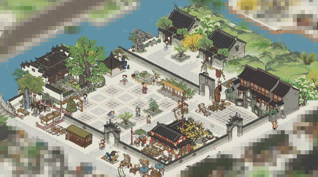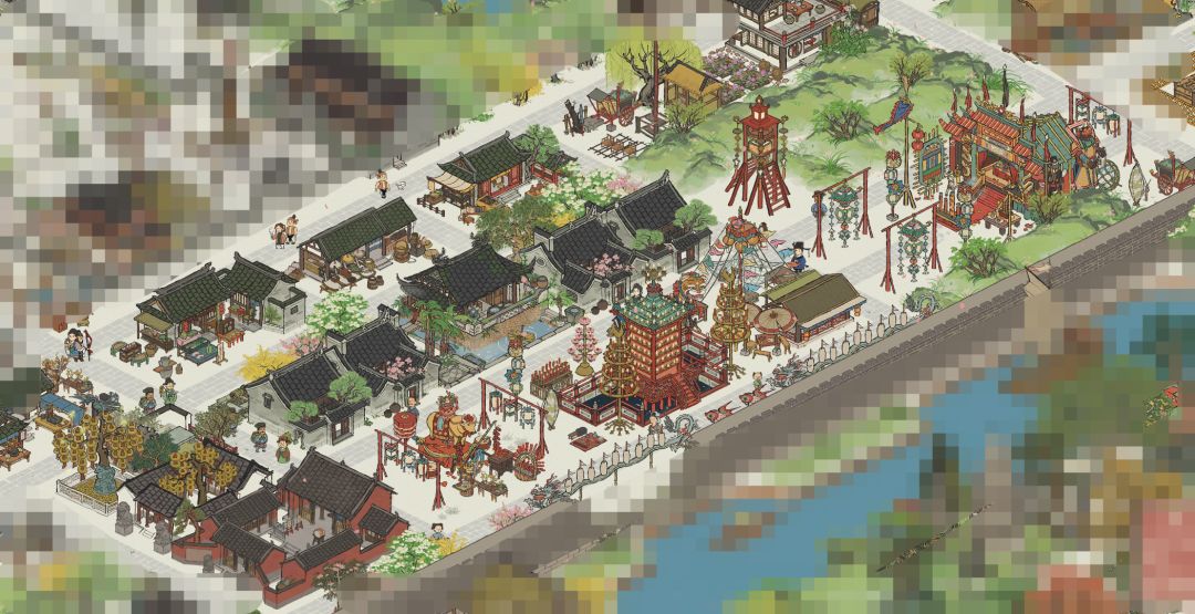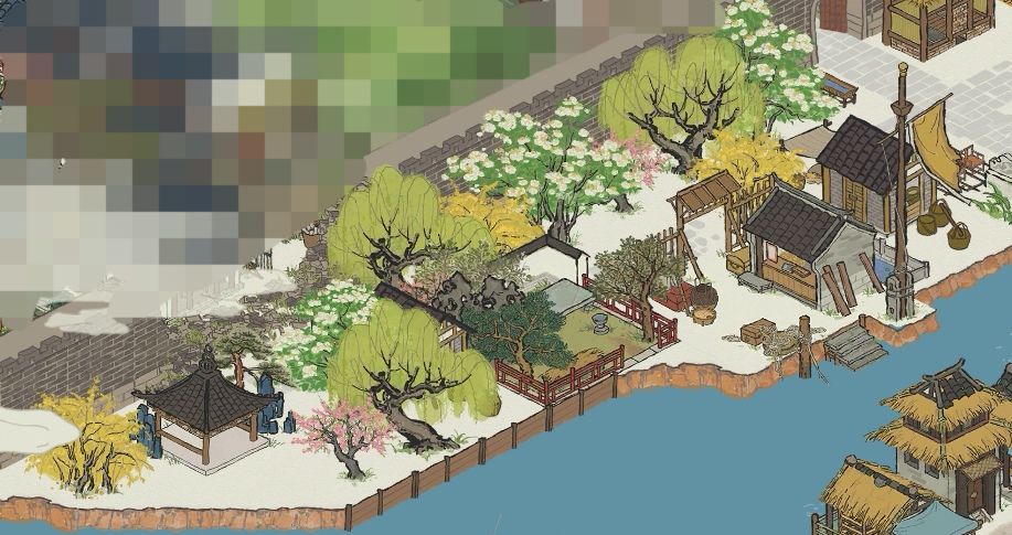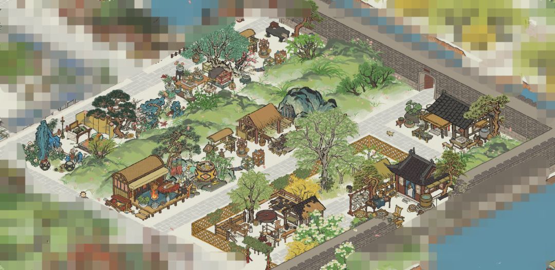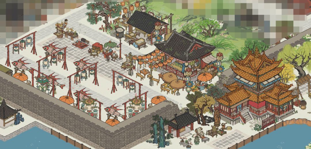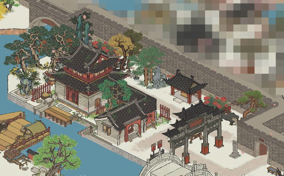 钞关自带的植物颜色较深,可以用“奇石盆景”、“东篱把酒”、“歇脚石”、“双子峰”和“棕榈树”来相配,钞关主体的红黑配色用“乌木牌坊”、石碑亭”、“牡丹”、“登闻鼓”和“禁止喧哗”来配。