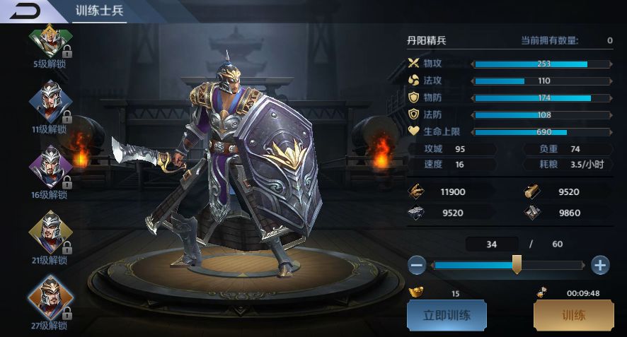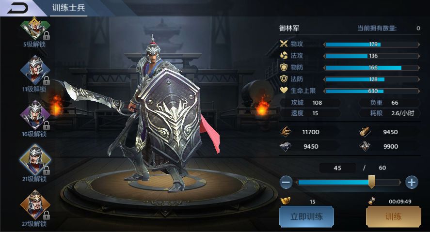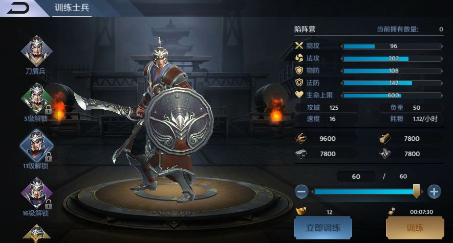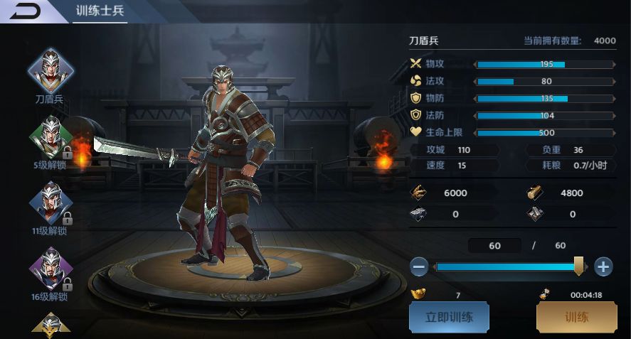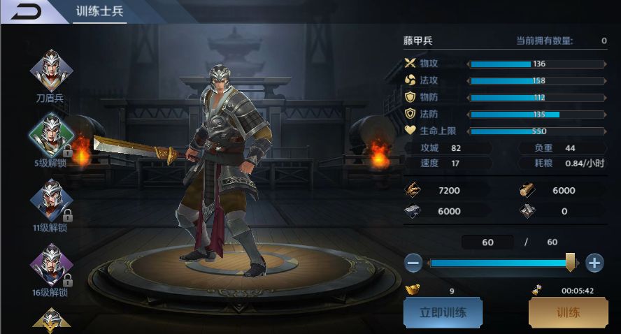 刀兵分为刀盾兵、藤甲兵、陷阵营、无当先军、御林军和丹阳精兵。主城内刀兵营等级达到5级可解锁藤甲兵、11级解锁陷阵营、16级解锁无当先军、21级解锁御林军,27级解锁丹阳精兵;刀盾兵为刀兵营的初始兵种,1级即可训练。