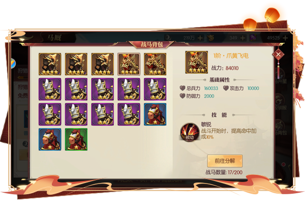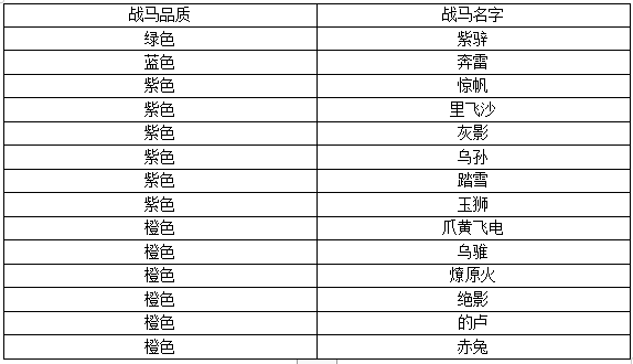 游戏中战马的品质分为绿、蓝、紫、橙,其中品质最好的是橙色战马,每个橙色战马都附带一个技能,其他品质的战马没有技能。打开战马背包,可以看到所有战马,包括品质、战力、基础属性等等,低品质的战马可以去分解系统进行分解,获取战马天赋、强化材料等等。