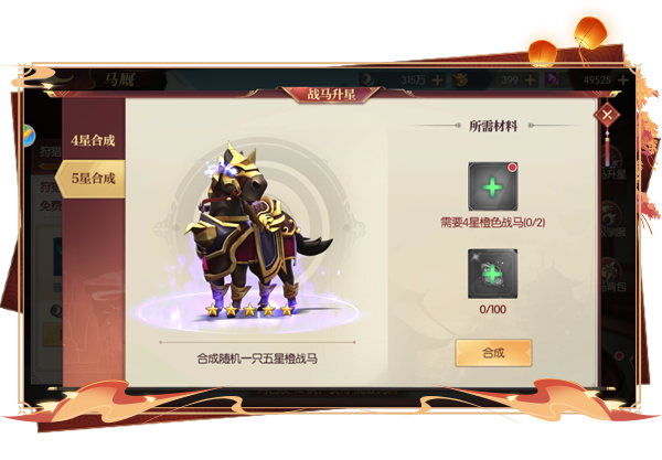 5星战马合成:需要2个4星橙色战马和100神马命魂。