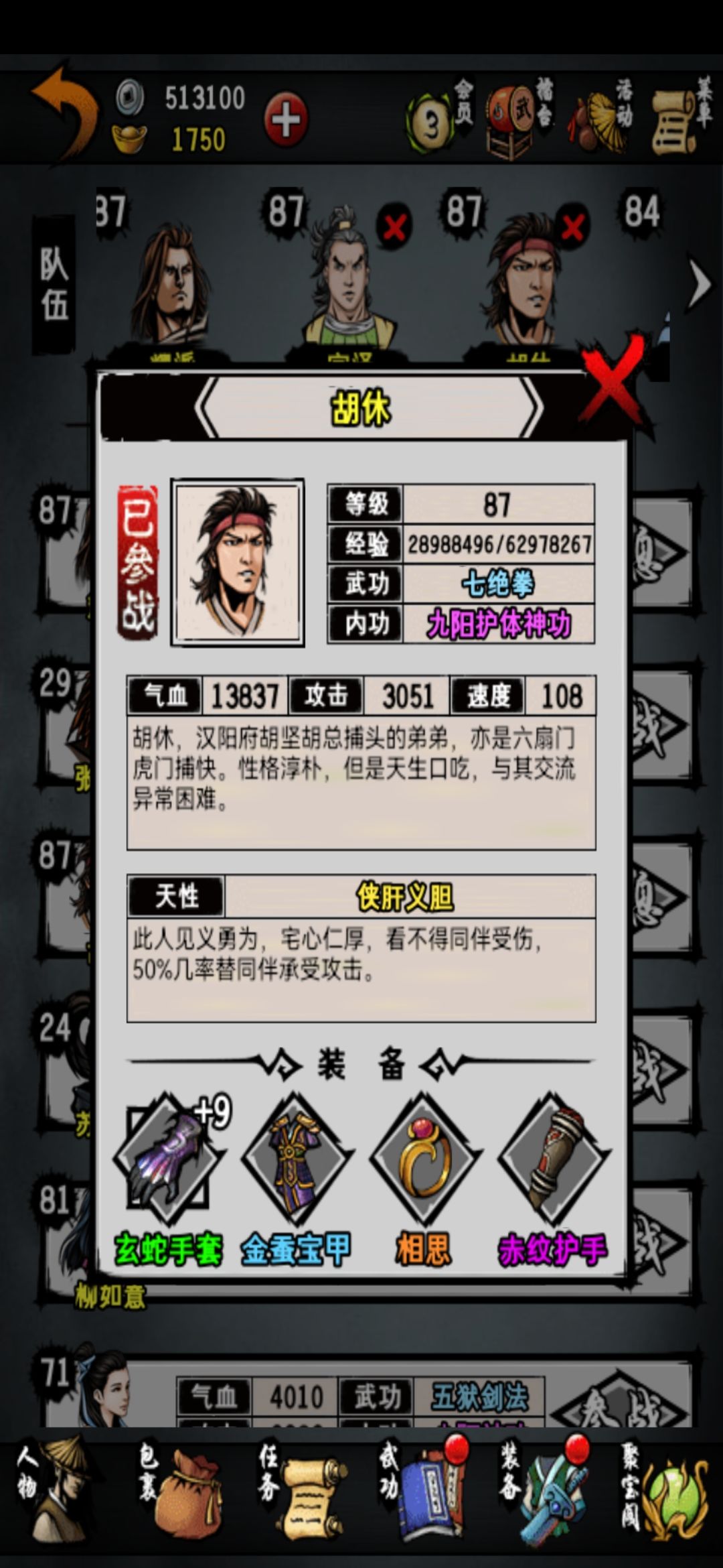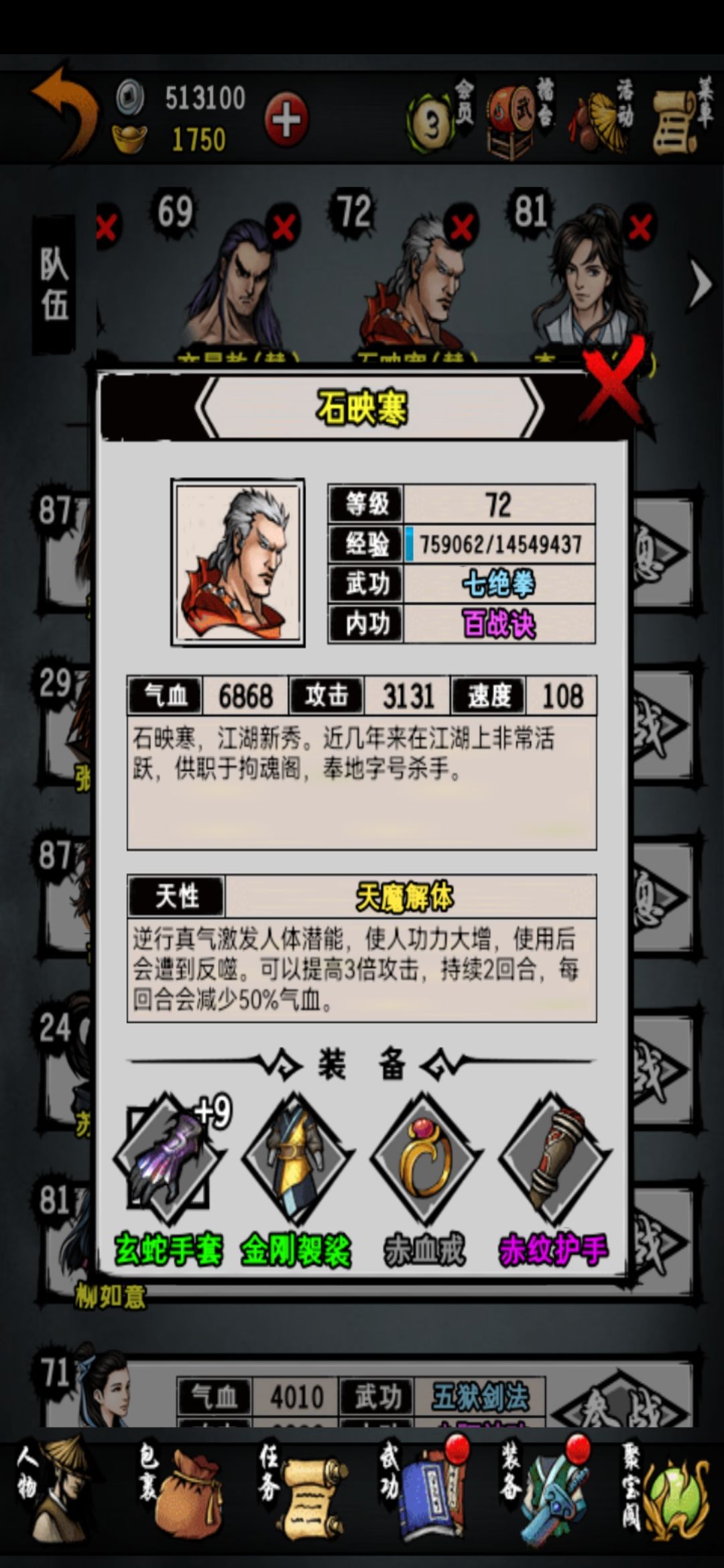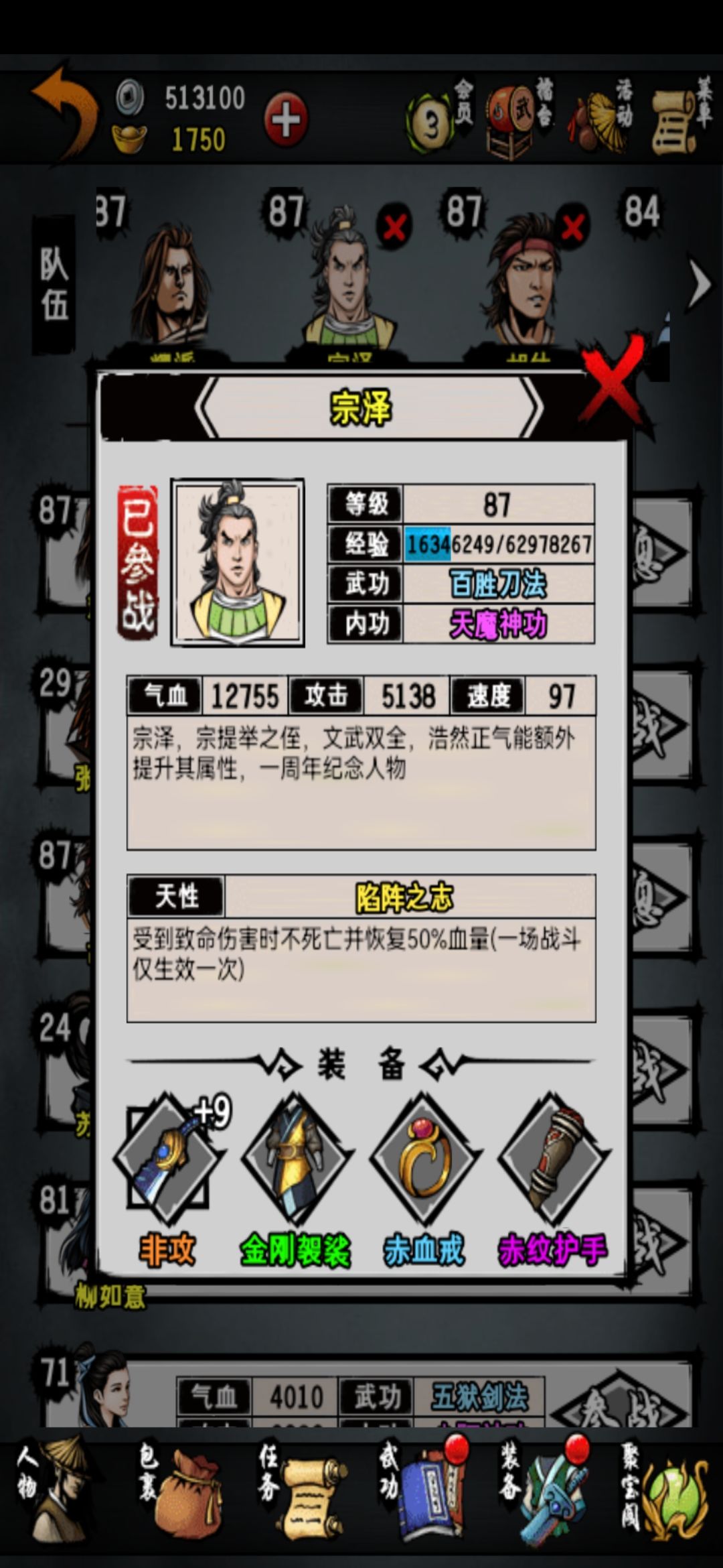 一本紫霞神功给了柳所以只能用达摩来配了,石的内功以前免流血现在不行了后面准备换成金狮加暴击,还有一个替补准备上商因为大理野怪掉百胜容易而且有流血,还差一个大理的神照继续努力了。清舞后面也会换成刀随或者女侠打收割(a级拳太极伤害低,七伤容易被闪避)