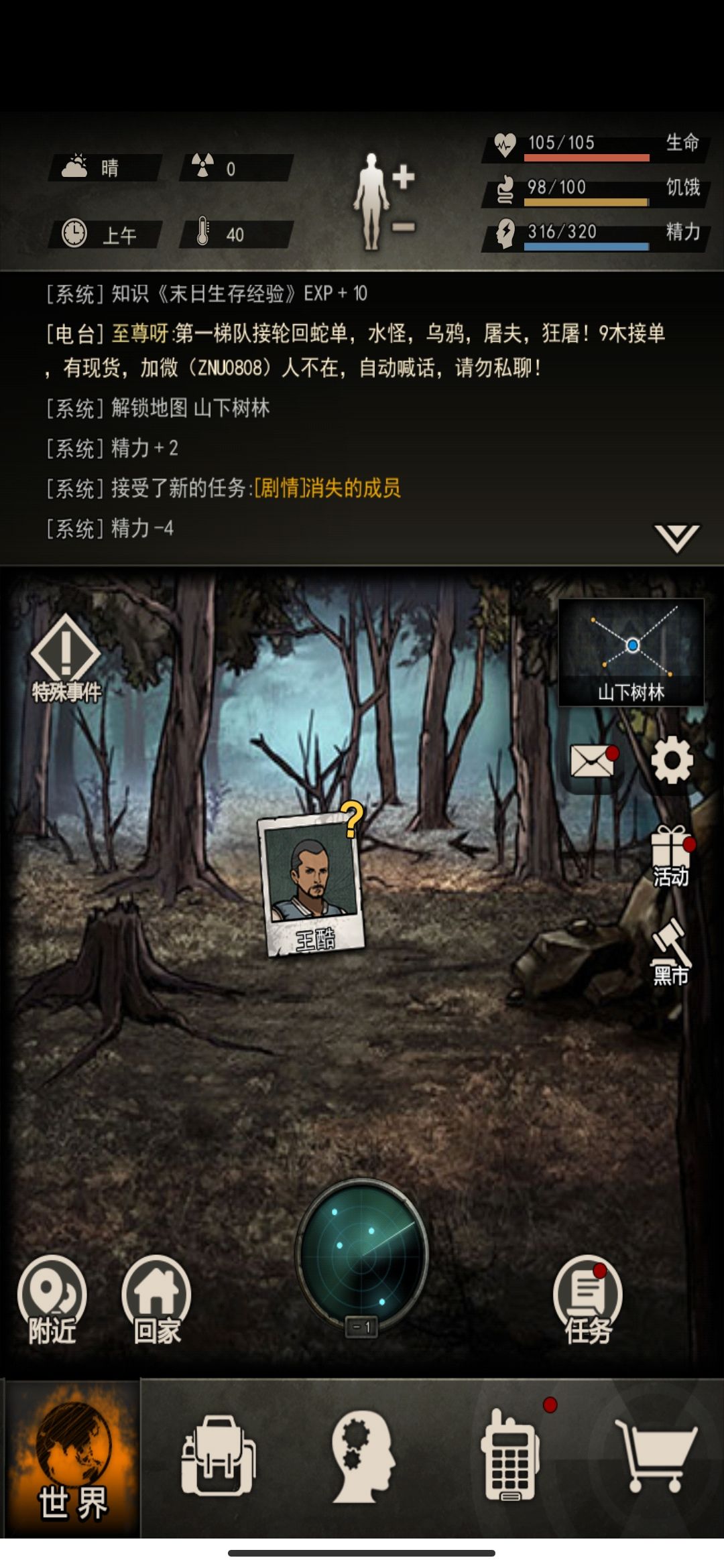 然后做完强制性新手教程以后不要领取这个王裤的任务,先点搜索多搜点物资(最重要的是那个特殊事件)