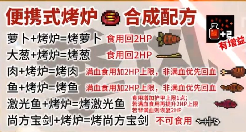 *烤肉,烤鱼,食用后,非满血回复两点血,满血则增加两点血量上限,回满血再食用更好
