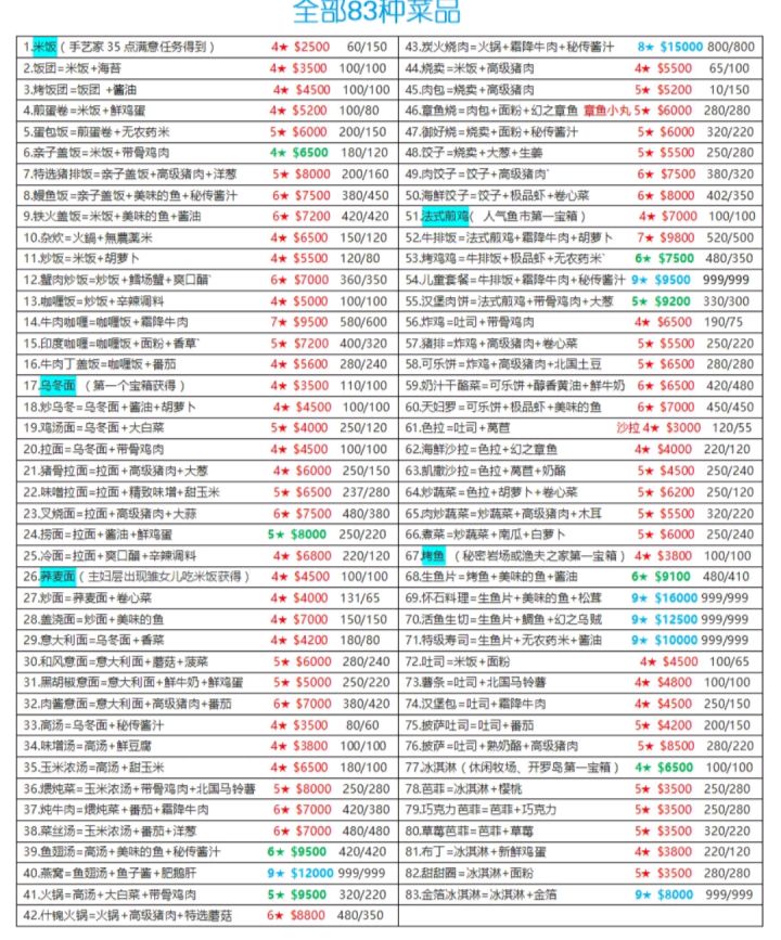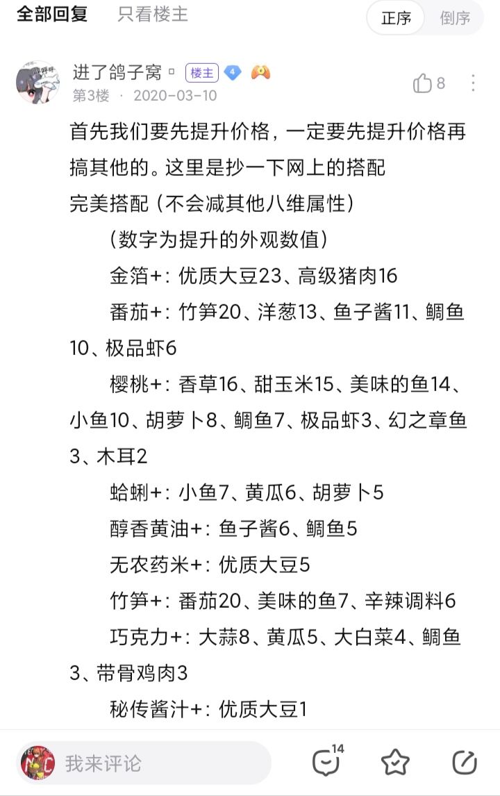 这个图蛮老的了,有几个不一样,试试就知道了。到后期就万能的用(金箔+大豆)(小贝壳+小鱼)(番茄+竹笋)来拉八维。最后的美观和香味就用(熟奶酪)来拉满。最后的最后的魅力味道就用(大葱)来拉(大葱和熟奶酪不会降八维)