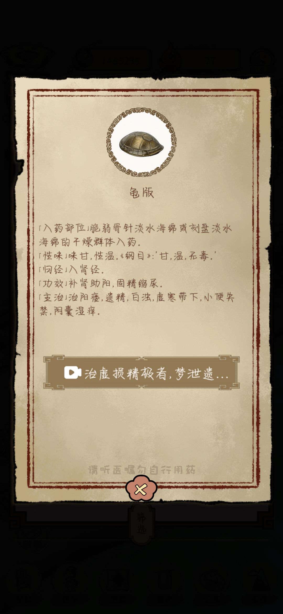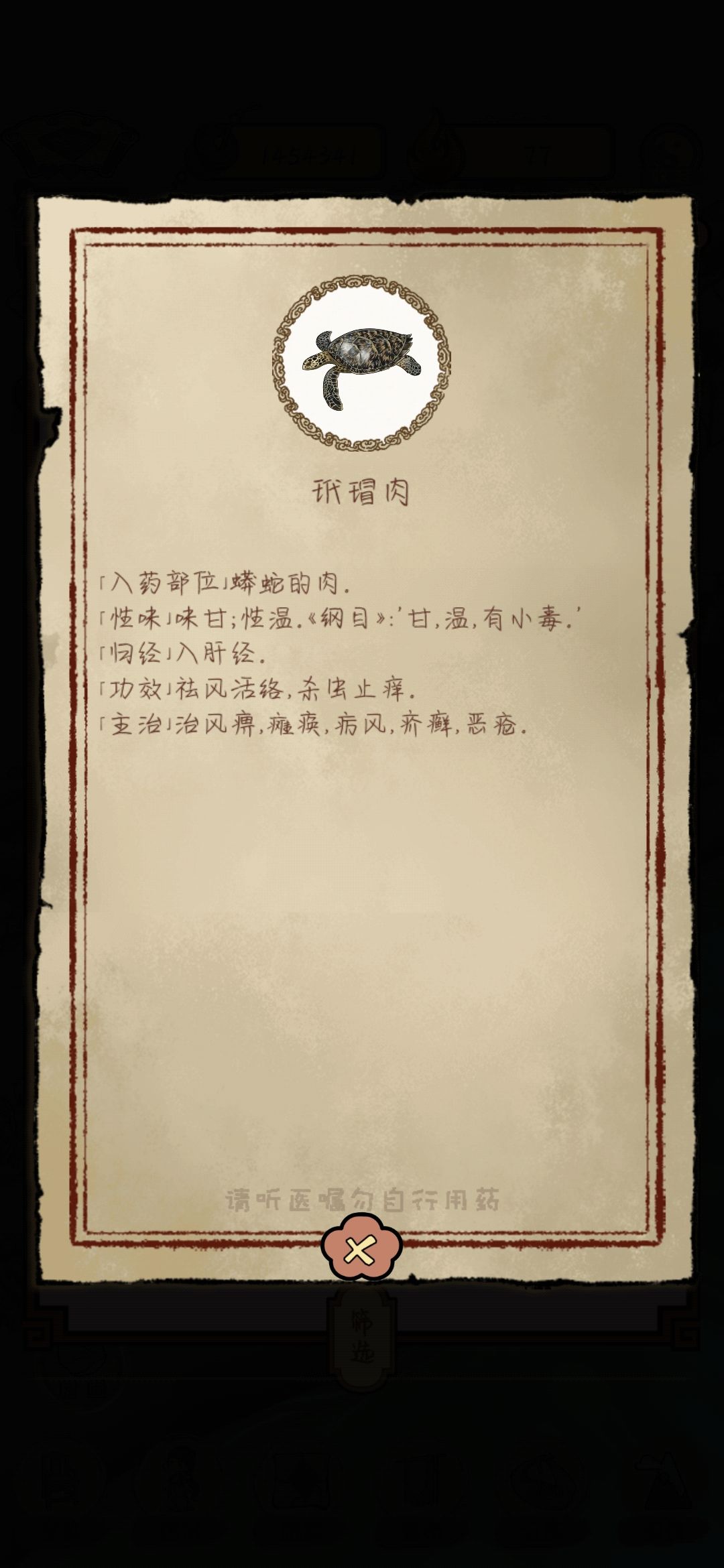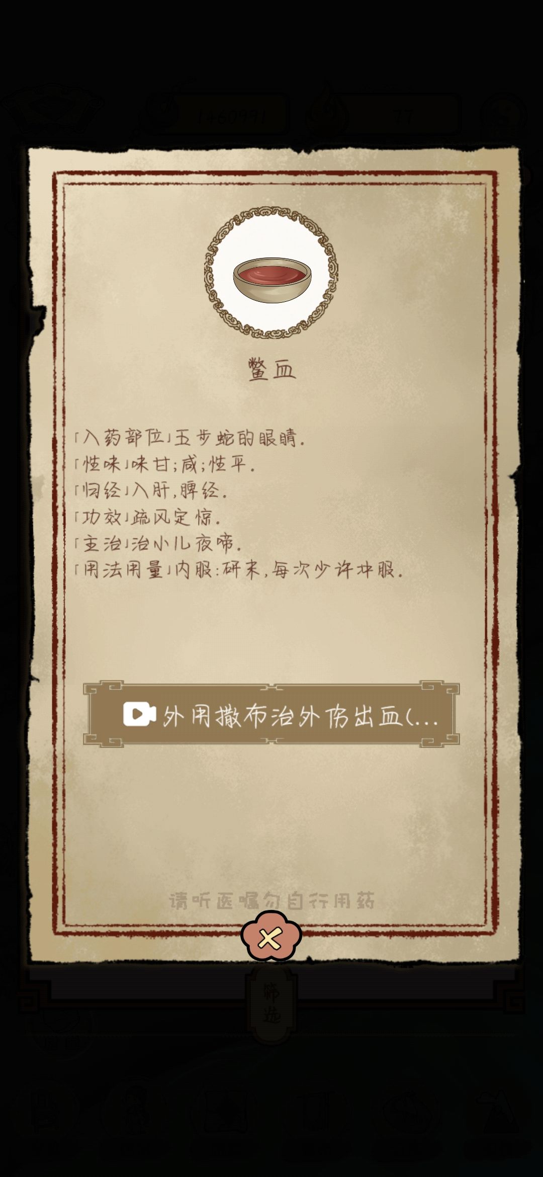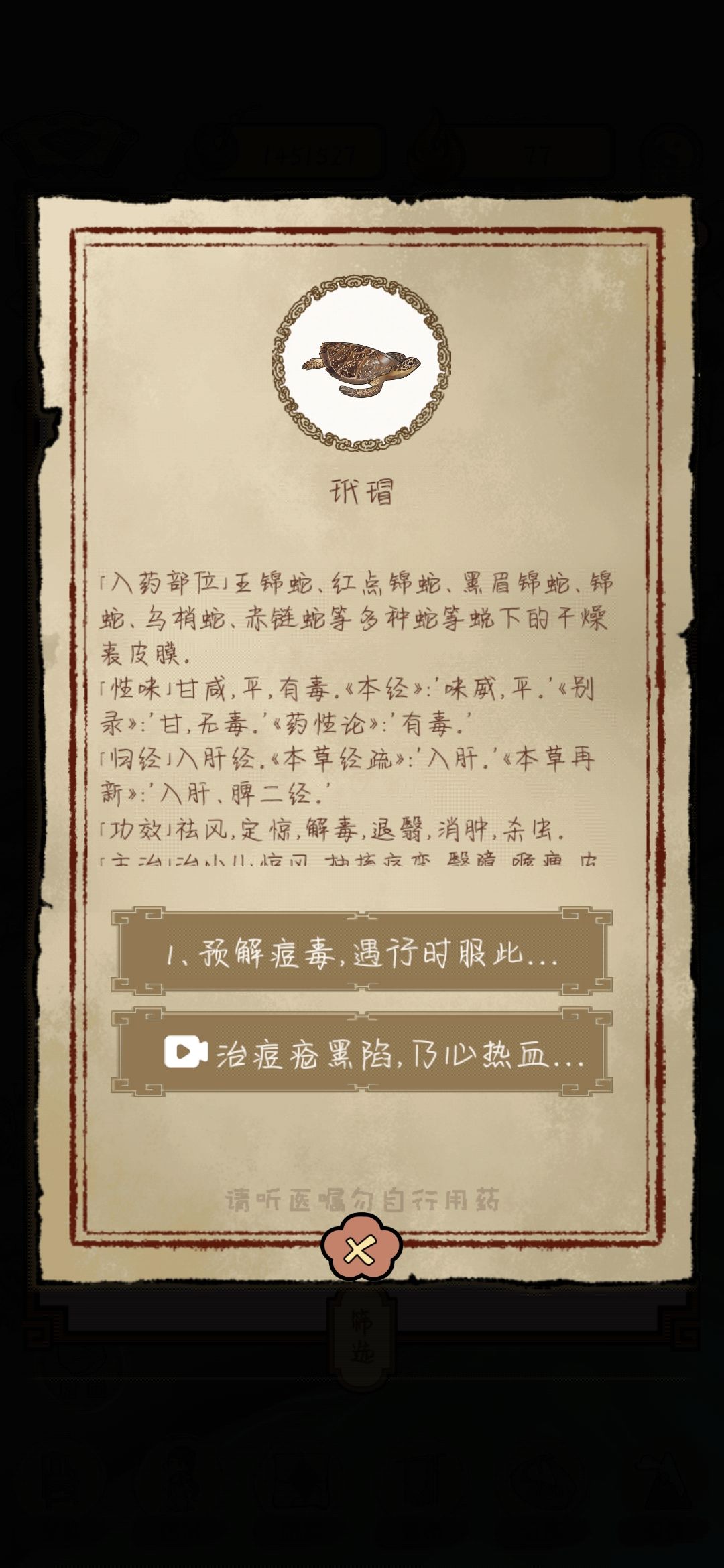 突然感觉这个游戏有点扯诶!为什么入药部位和蛇有那么大的关系?尤其是最后一个,入药部位居然是五步蛇的眼睛,但是他不是叫鳖血嘛?反正先不管功效什么的,光名字和入药部位的对比就够扯了吧。难道因为开发者公司酷爱蟒蛇???